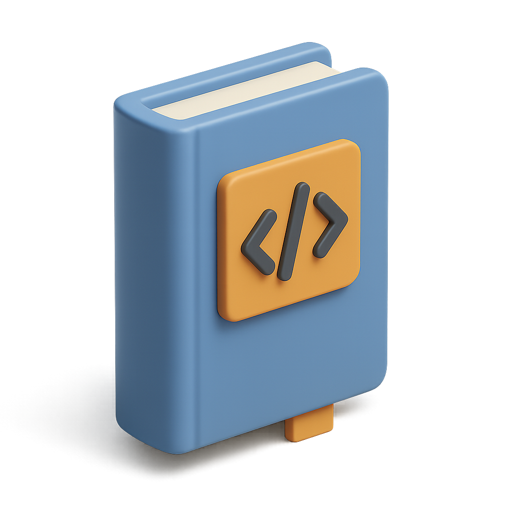 A three-dimensional icon representing building code, featuring a blue book with a yellow coding symbol on the cover. The design has a transparent background and a volumetric, isometric feel.
