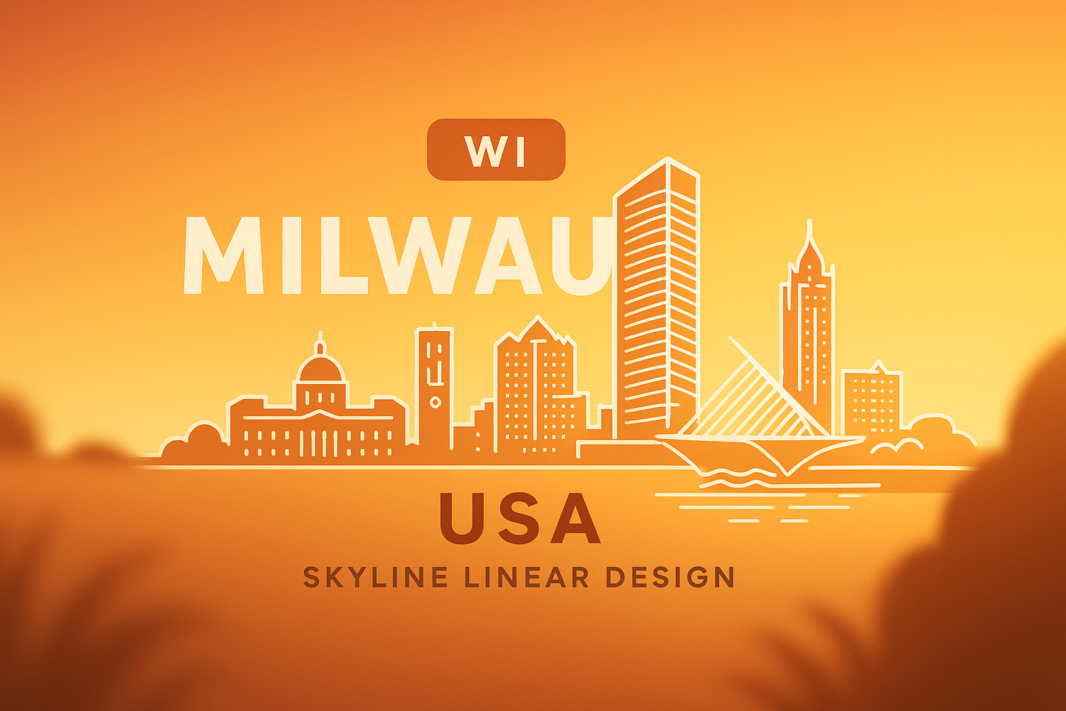 Stylized linear illustration of the Milwaukee skyline against a gradient orange background, perfect for travel promotions or city-themed decor.