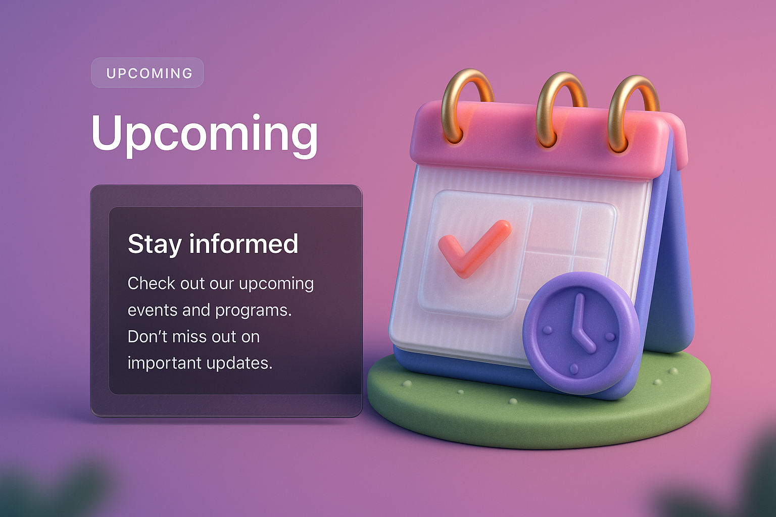 A vibrant 3D illustration featuring a calendar with a checkmark and a clock, set against a smooth gradient background. Includes a dark panel with text for updates.