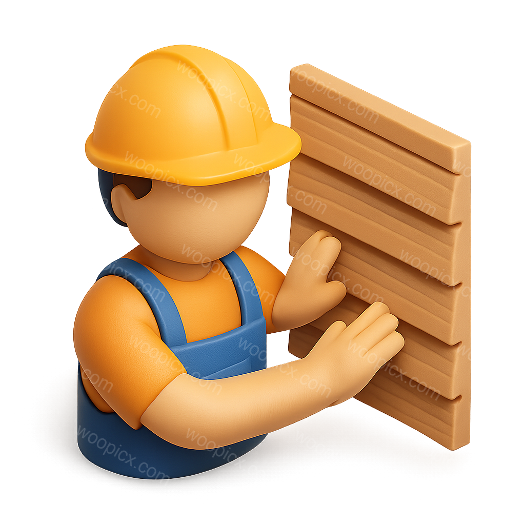 A 3D icon featuring a siding installer wearing a hard hat and working with wooden panels, designed in an isometric style with a transparent background.