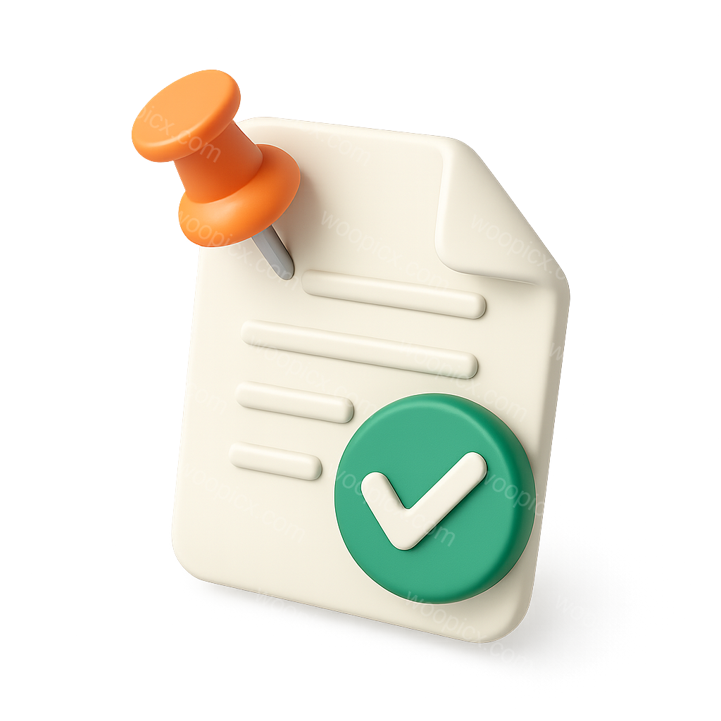 /Premium/Collection: /by davooda/A stylized 3D icon representing a document featuring a green checkmark and an orange pushpin, designed in a three-quarter isometric view with a transparent background.
