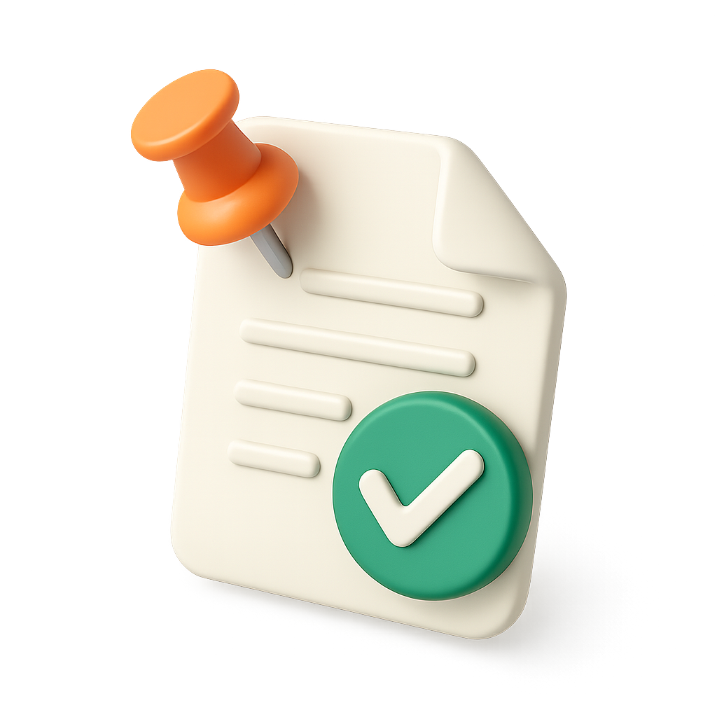 A stylized 3D icon representing a document featuring a green checkmark and an orange pushpin, designed in a three-quarter isometric view with a transparent background.