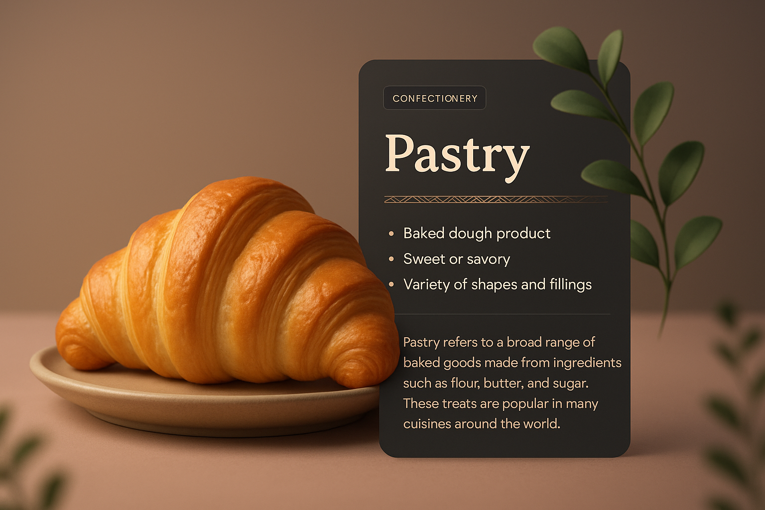 /Collection: /by davooda/Type: PNG/A beautifully rendered 3D croissant pastry set on a beige plate, accompanied by a dark informational card that highlights its characteristics and context. The background features a smooth gradient for a pleasing aesthetic.
