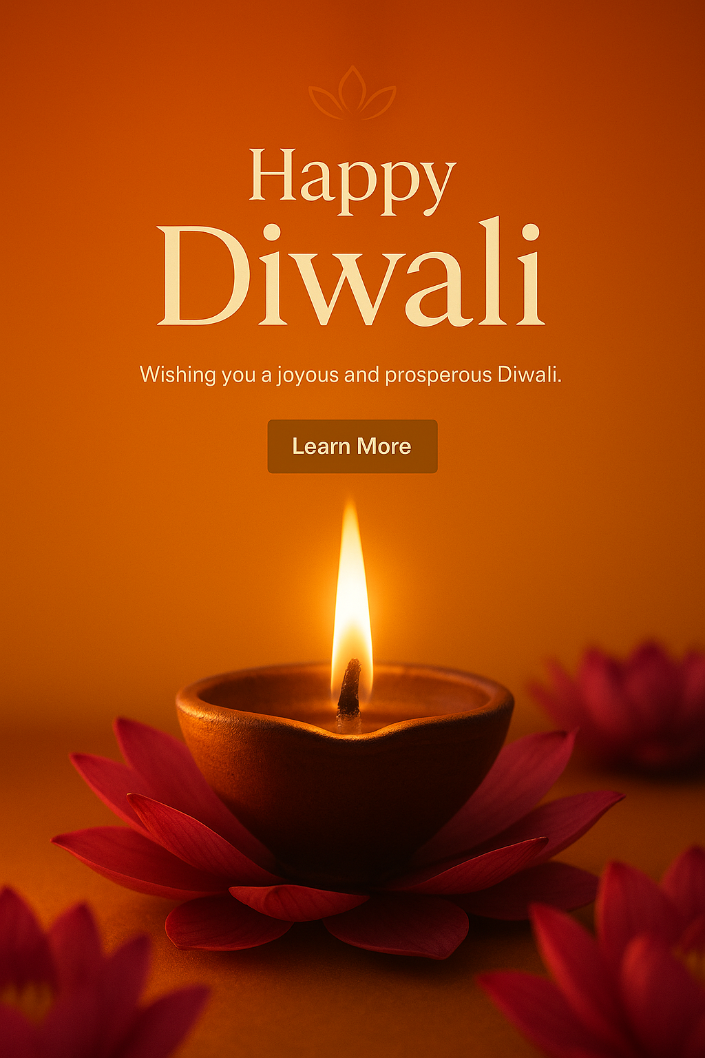 /Collection: /by davooda/Type: PNG/A festive image featuring a lit diya surrounded by lotus flowers, ideal for Diwali greetings. The warm color scheme and elegant typography create a joyful atmosphere.
