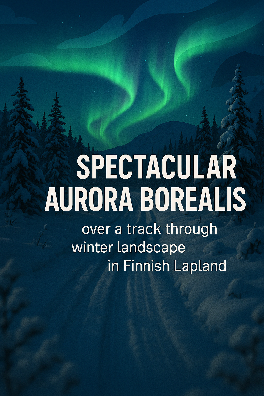 A visually captivating illustration of the Aurora Borealis illuminating a winter landscape in Finnish Lapland, ideal for travel promotions or nature-themed content.