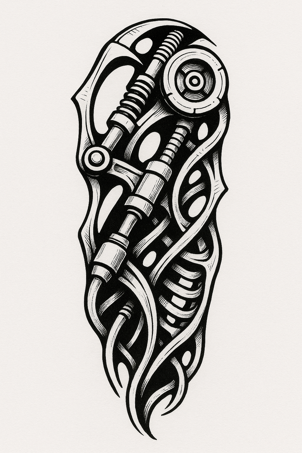 This image features an intricate black and white design that blends mechanical and organic elements, suitable for digital art enthusiasts and graphic design projects.