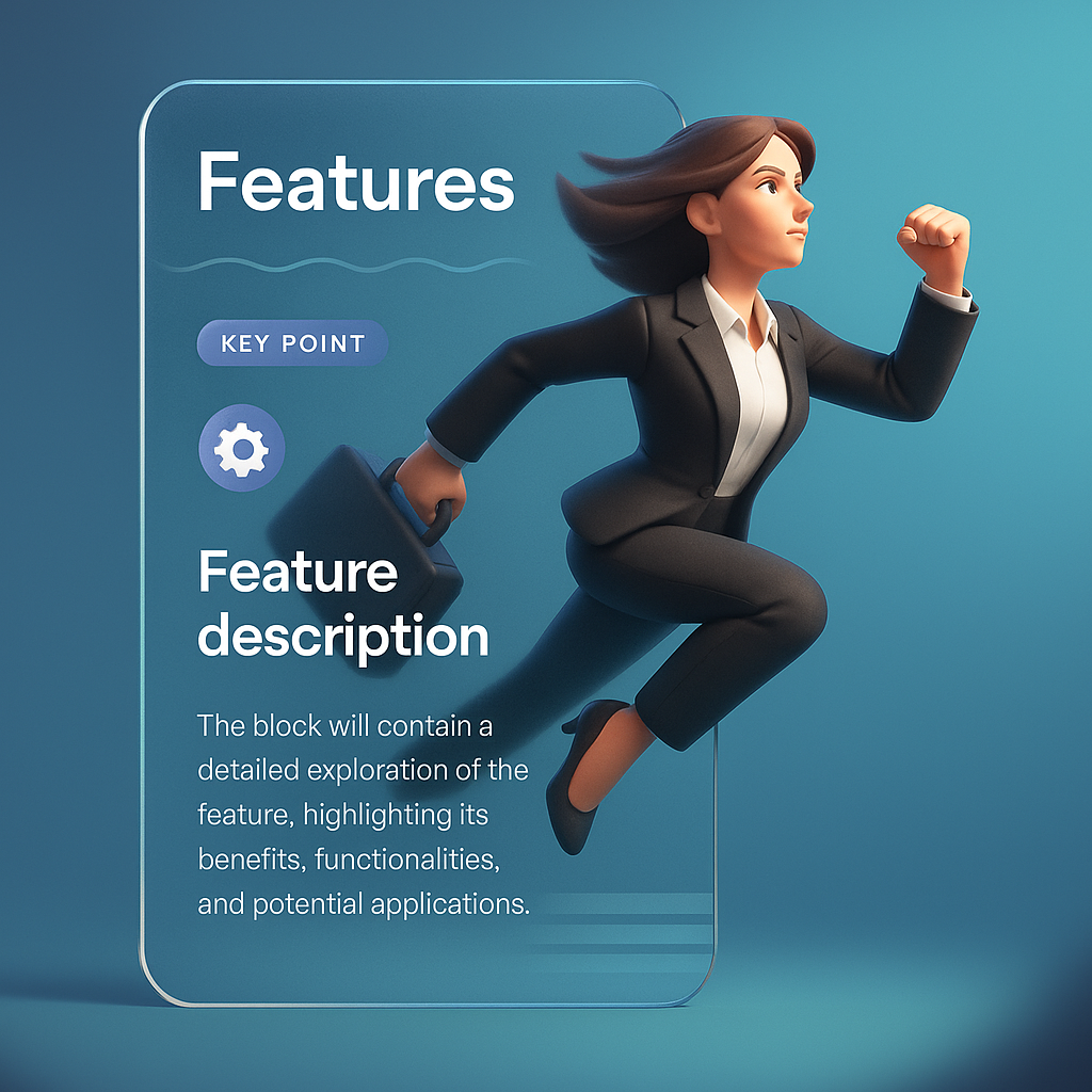 A vibrant 3D illustration of a business woman in motion, integrating an innovative feature block with a glass-like effect, suitable for web design.