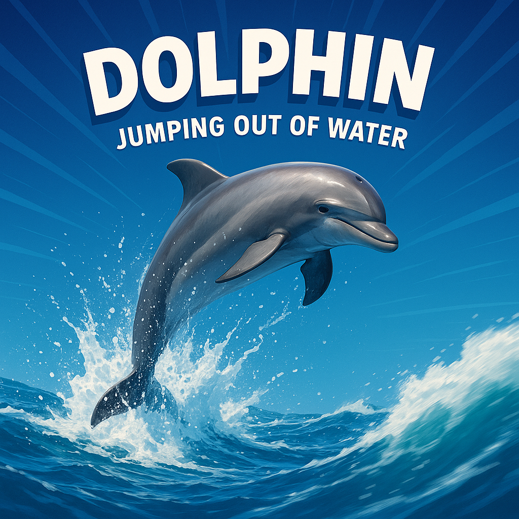 This colorful illustration features a dolphin leaping from the ocean, showcasing a dynamic and playful theme. Ideal for educational materials or ocean-themed content.