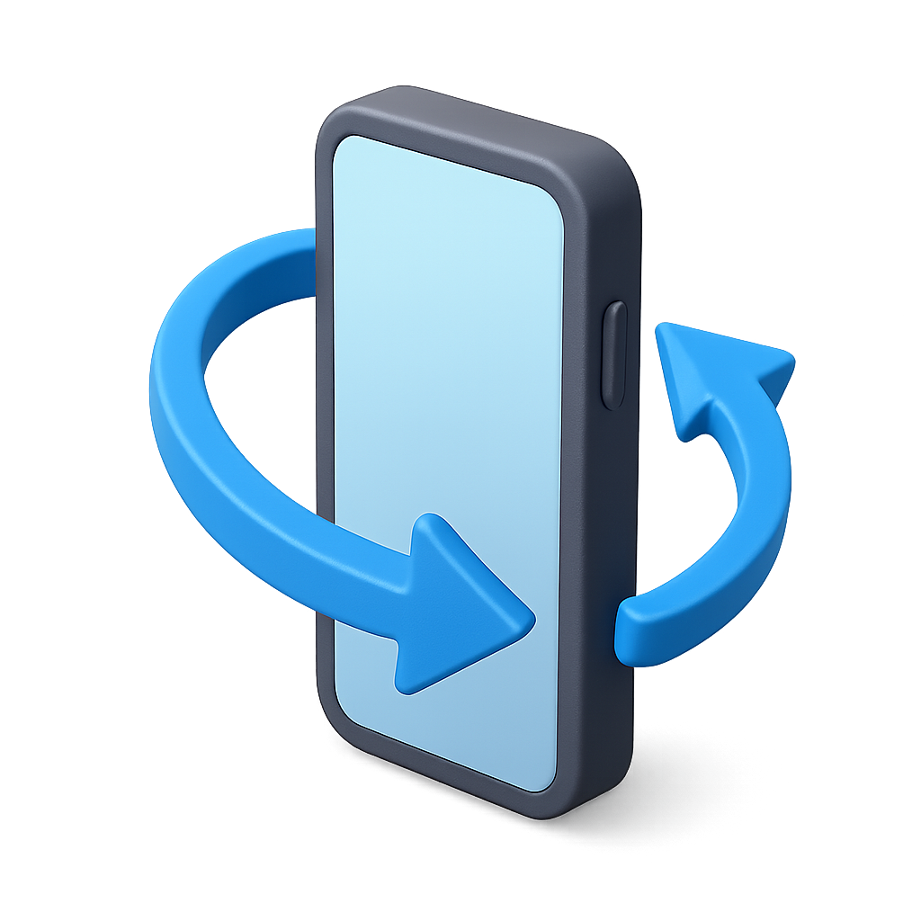 A modern 3D icon of a smartphone featuring a rotation arrow around it, rendered in a transparent background. The design emphasizes a volumetric, isometric view.