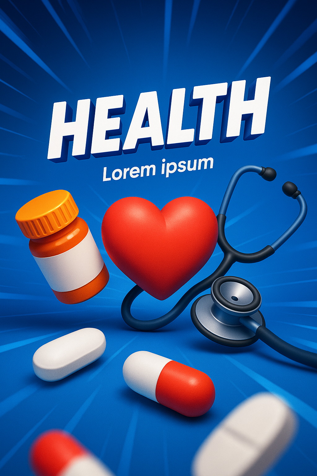 A vibrant graphic showcasing medical elements like pills, a stethoscope, and a heart, ideal for health-related campaigns or educational content.