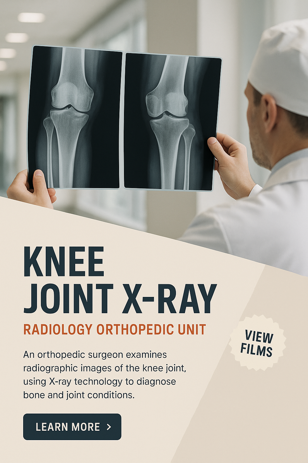 An orthopedic surgeon reviews knee joint X-ray films in a radiology unit, showcasing advanced imaging technology for diagnosing conditions.
