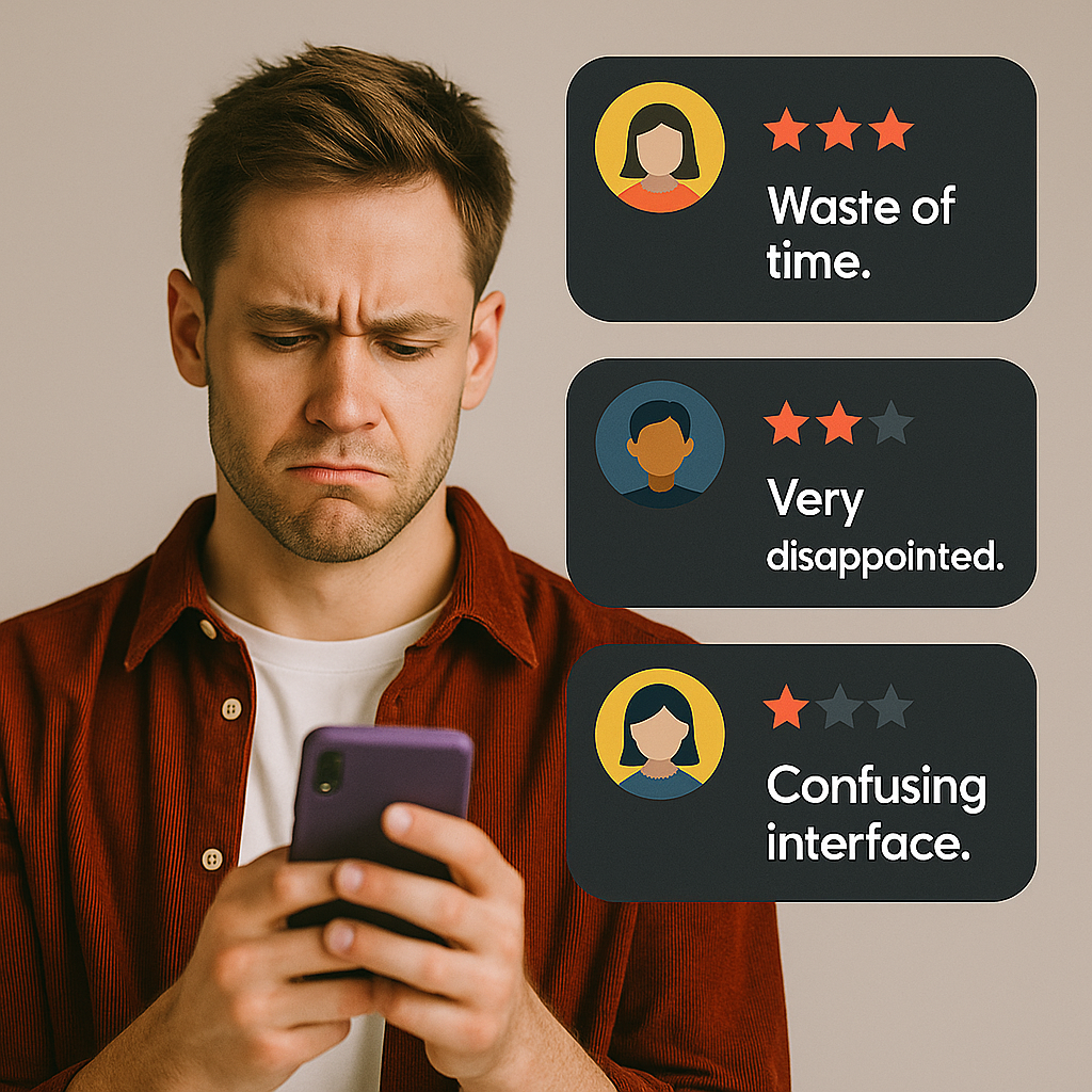 An engaging image depicting a young man reading negative user reviews on a smartphone, illustrating themes of user experience and feedback. Ideal for articles or presentations on app development.