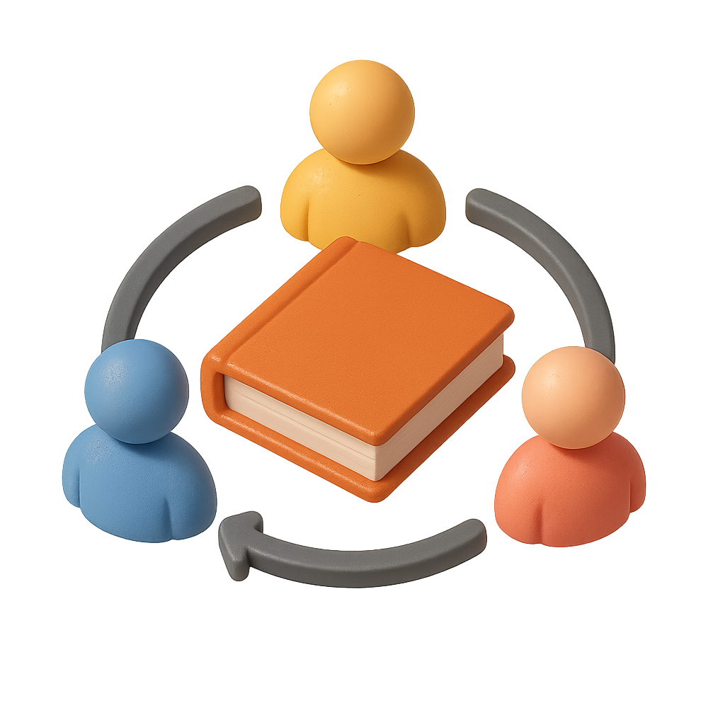 A vibrant 3D illustration of a book surrounded by three stylized figures in different colors, symbolizing a book club. The design features a transparent background and an isometric view.