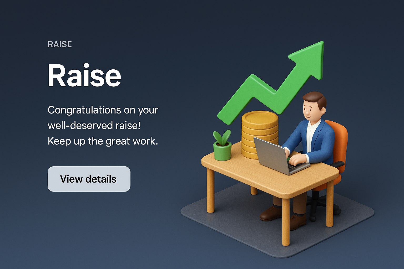A detailed 3D scene showcasing a character at a desk with a laptop, symbolizing a raise. It features a green upward arrow, coins, and a plant, set against a dark gradient background.