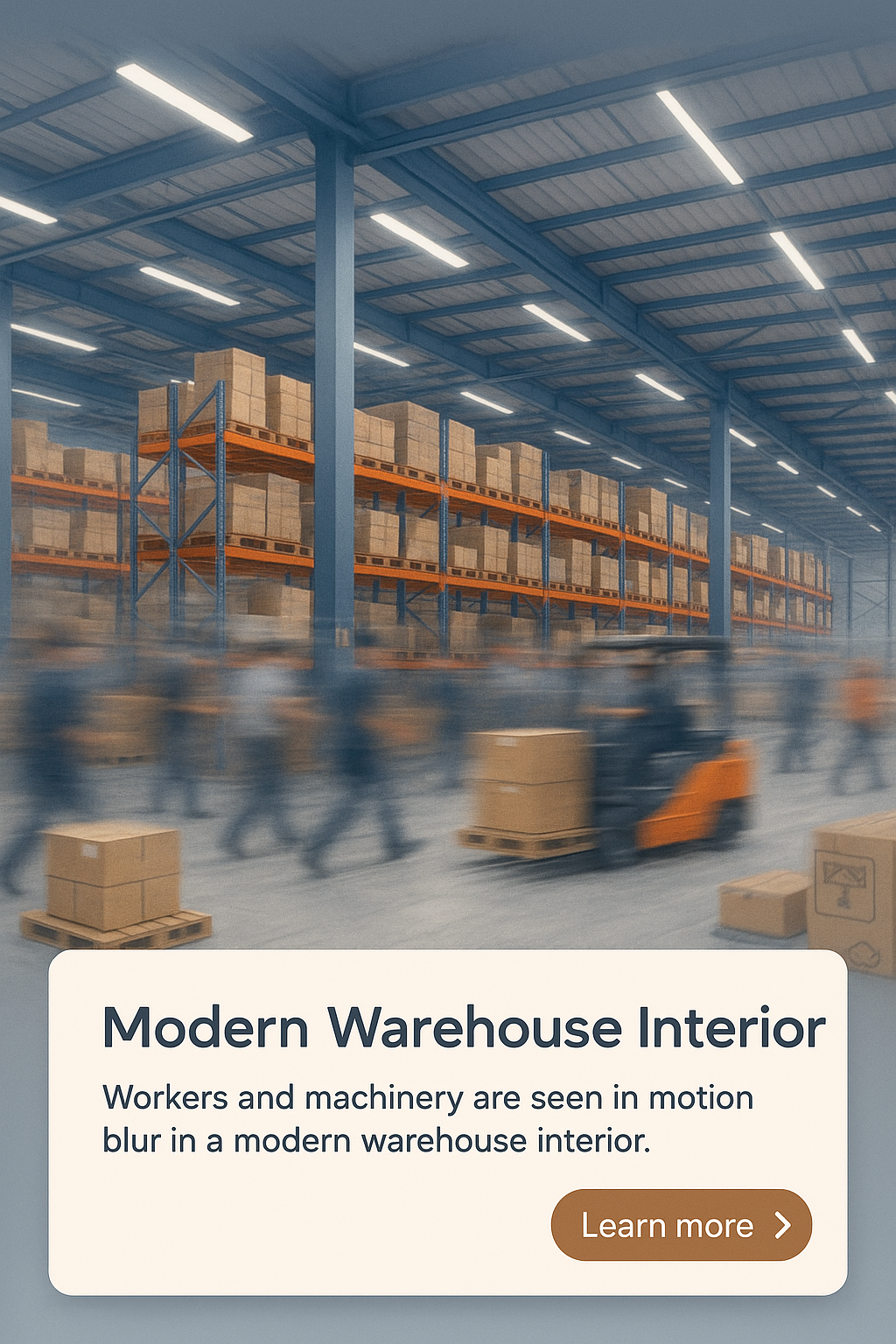 /Collection: /by davooda/Type: PNG/A long exposure shot of a modern warehouse interior showcasing workers and machinery in motion blur. The scene captures the bustling activity in a spacious, organized environment.