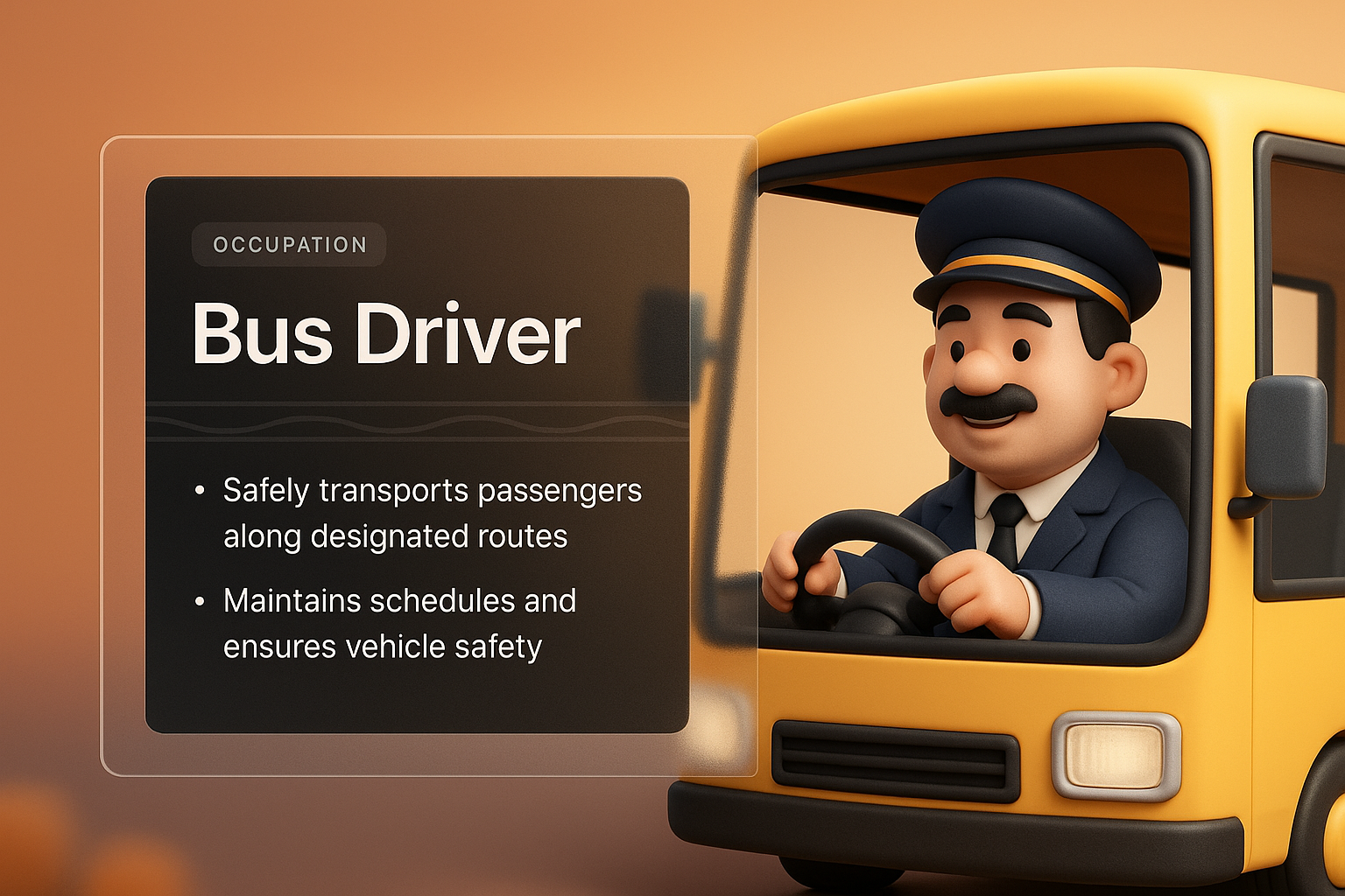 /Collection: /by davooda/Type: PNG/A 3D illustration of a bus driver inside a bus, featuring a sleek design with an integrated dark panel showcasing occupation details. The visual blends realism with a modern web aesthetic.