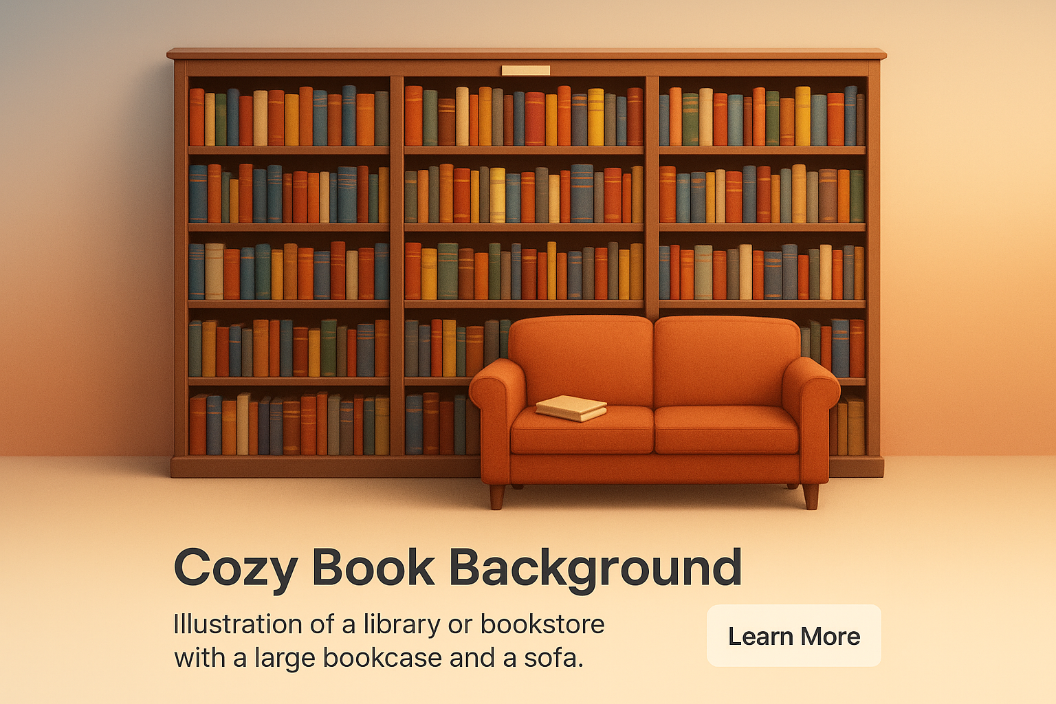 /Collection: /by davooda/Type: PNG/A visually appealing 3D illustration of a cozy library featuring a large bookshelf filled with books and a comfortable sofa for reading. The background has a smooth gradient.