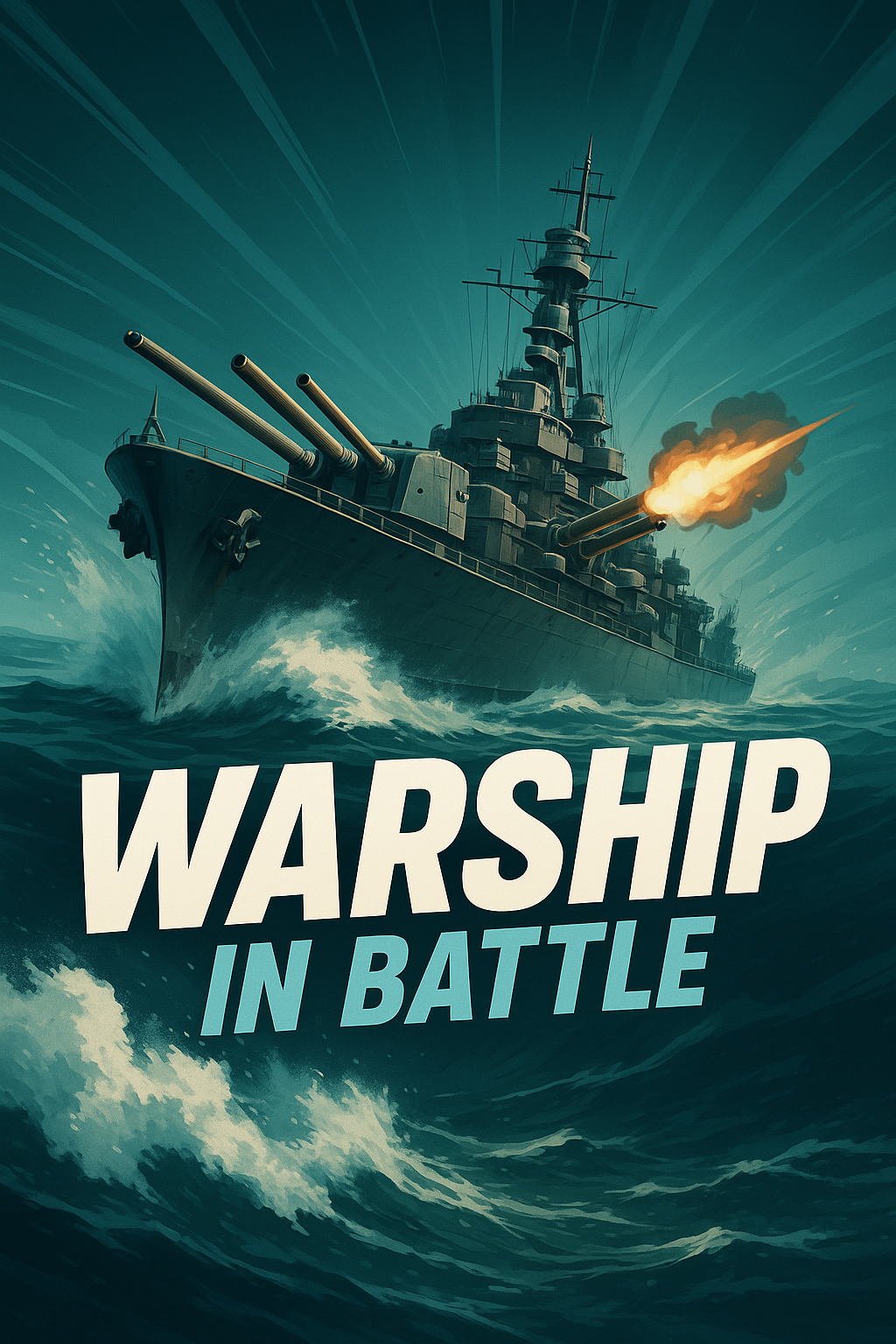 A striking illustration of a warship engaged in battle, featuring dynamic lines and a powerful color palette. The title is prominently displayed with a bold font, enhancing the dramatic scene.