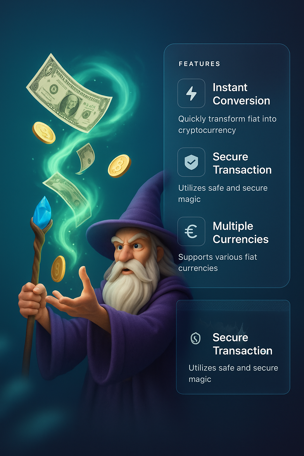 A dynamic 3D illustration of a wizard casting a spell that converts fiat currency into cryptocurrency, surrounded by floating coins and magical effects.