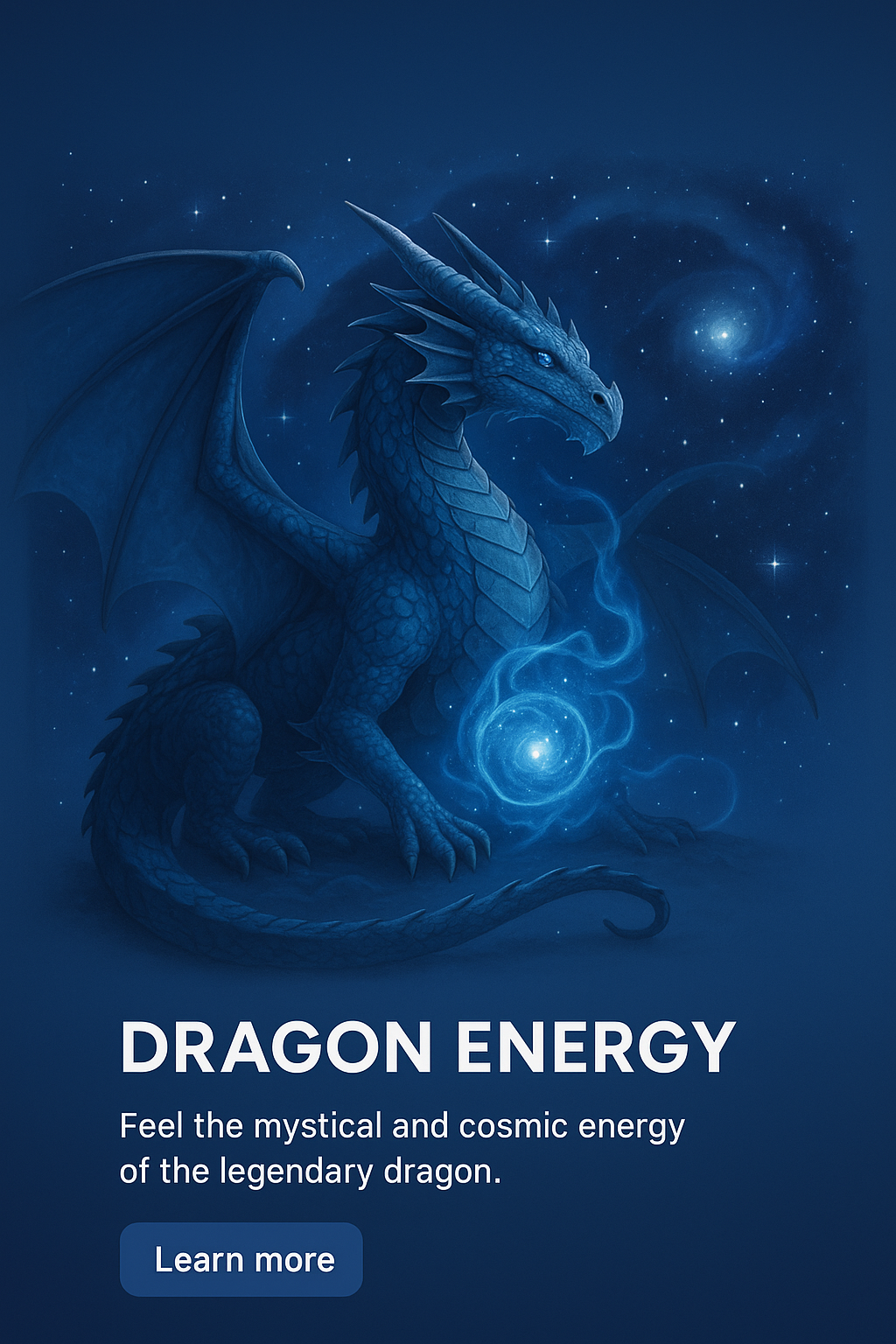 A stunning 3D illustration of a blue dragon surrounded by celestial elements, embodying mythical energy. The design features a cosmic background with a smooth gradient, enhancing the magical atmosphere.