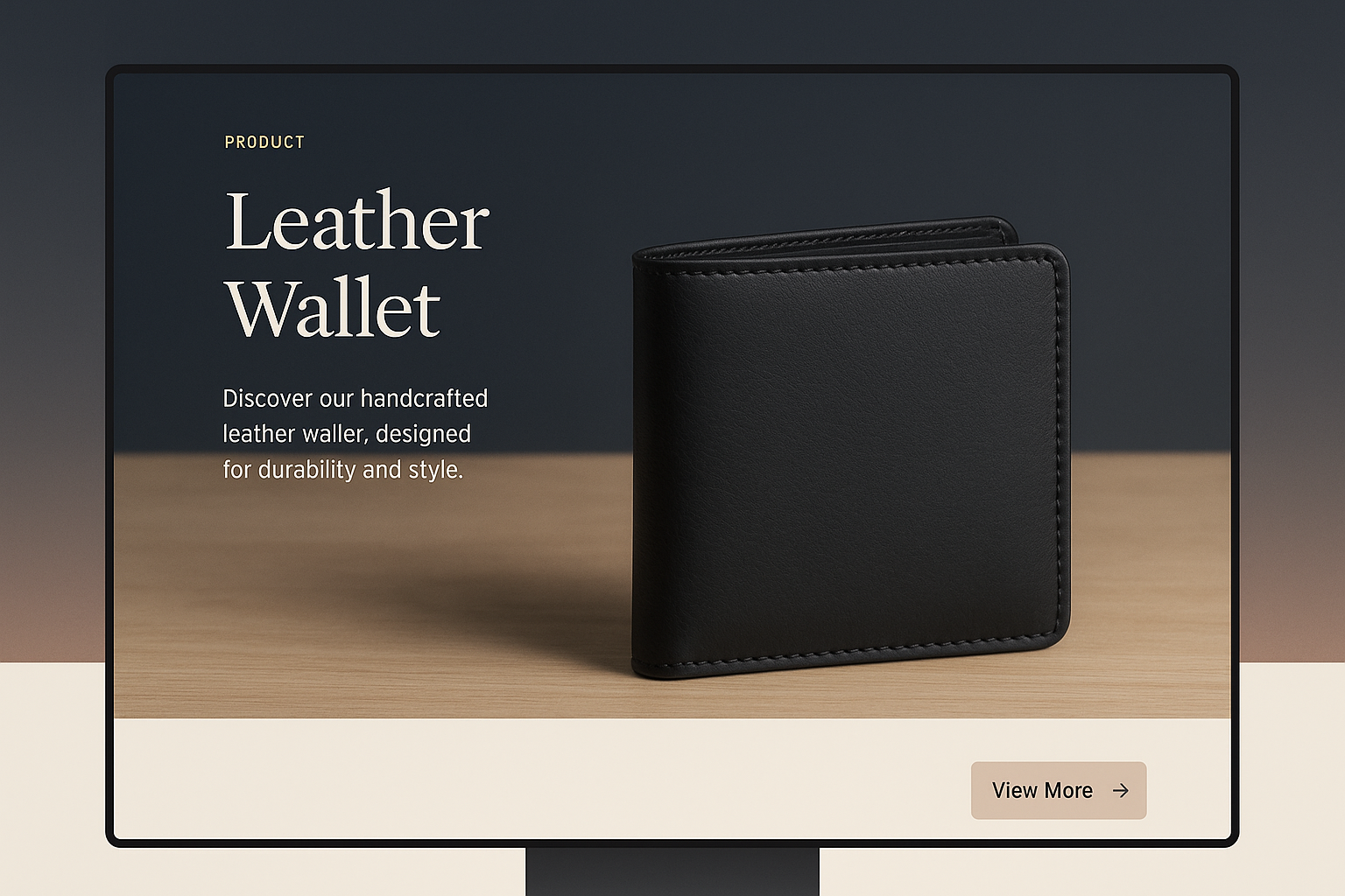 A modern web design showcasing a leather wallet. The layout features a sleek black wallet on a wooden surface with a gradient background, highlighting product details and a call-to-action button.
