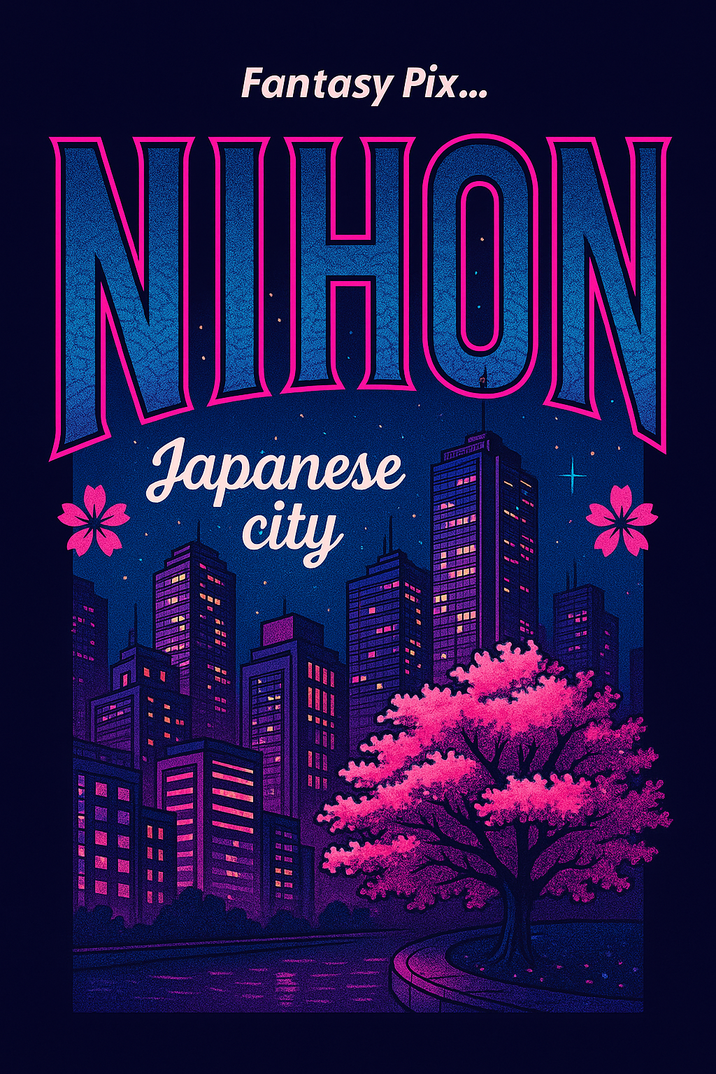/Collection: /by davooda/Type: PNG/Colorful illustration depicting a Japanese city skyline at night, featuring cherry blossoms and tall buildings, ideal for fantasy-themed graphics or travel-related content.
