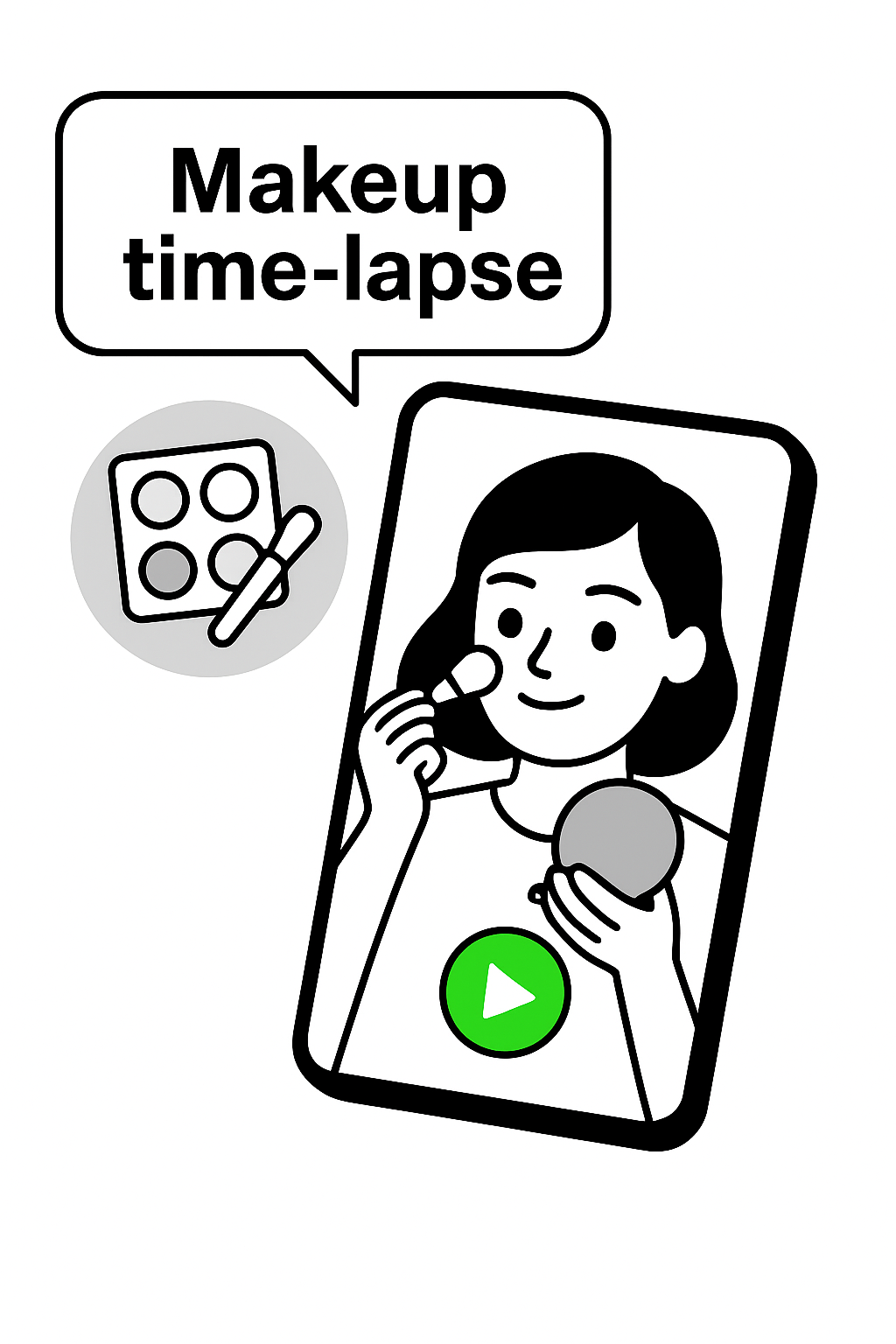 A minimalist illustration depicting a person applying makeup, designed for a tutorial or social media post, featuring a phone and makeup items.