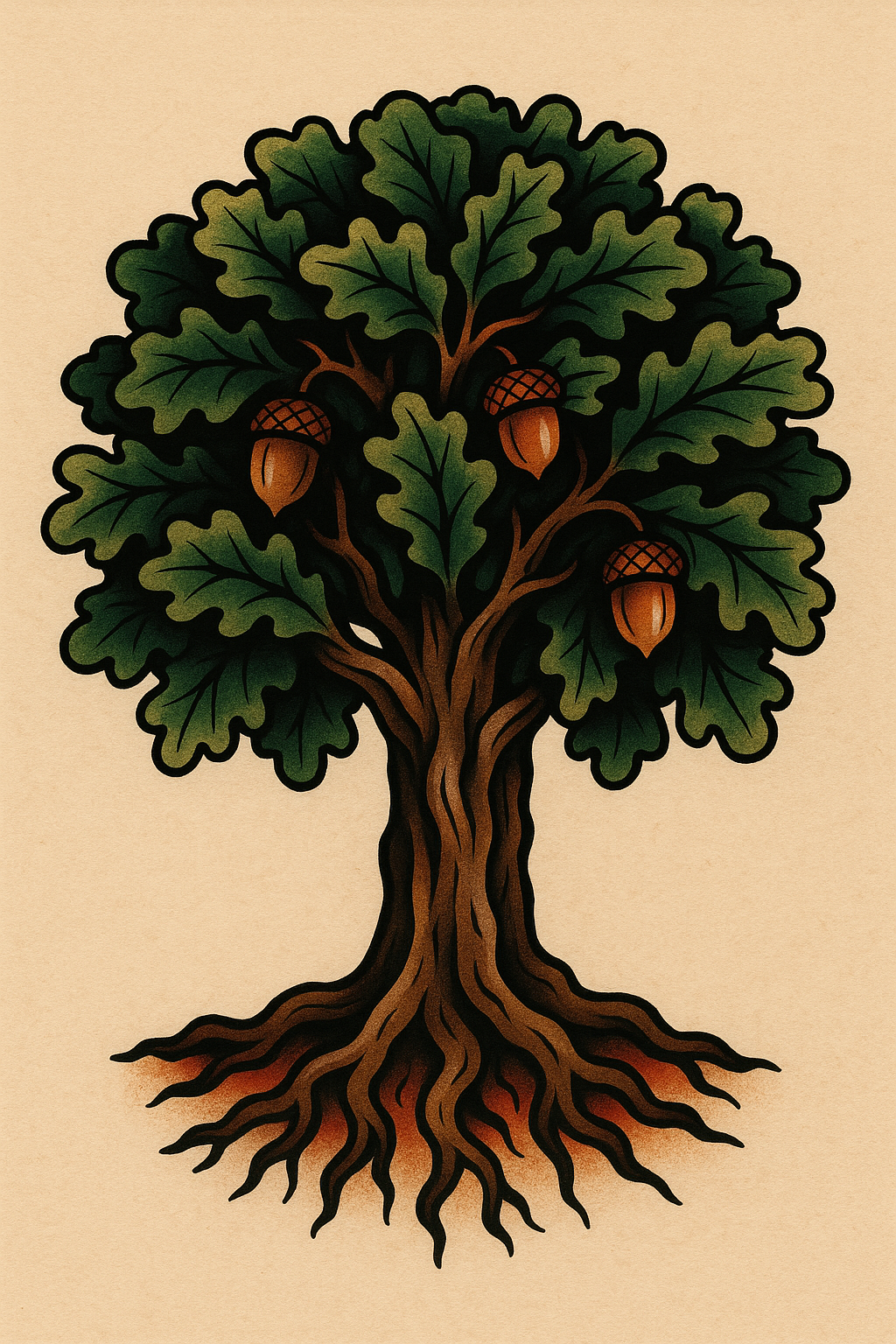 A detailed illustration of a lush oak tree featuring acorns, designed in a vibrant yet muted color palette. Ideal for nature-themed projects, decor, or educational materials.