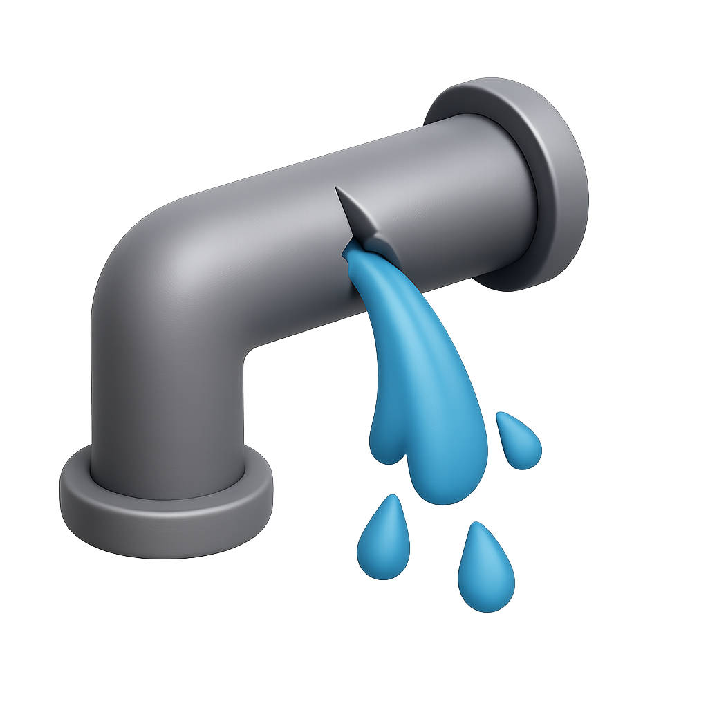 /Collection: /by davooda/Type: PNG/A 3D representation of a broken pipe, showcasing water leaking out in a stylized manner. The pipe is gray with a smooth finish, and blue droplets are depicted as they flow downward, adding a dynamic element to the design.