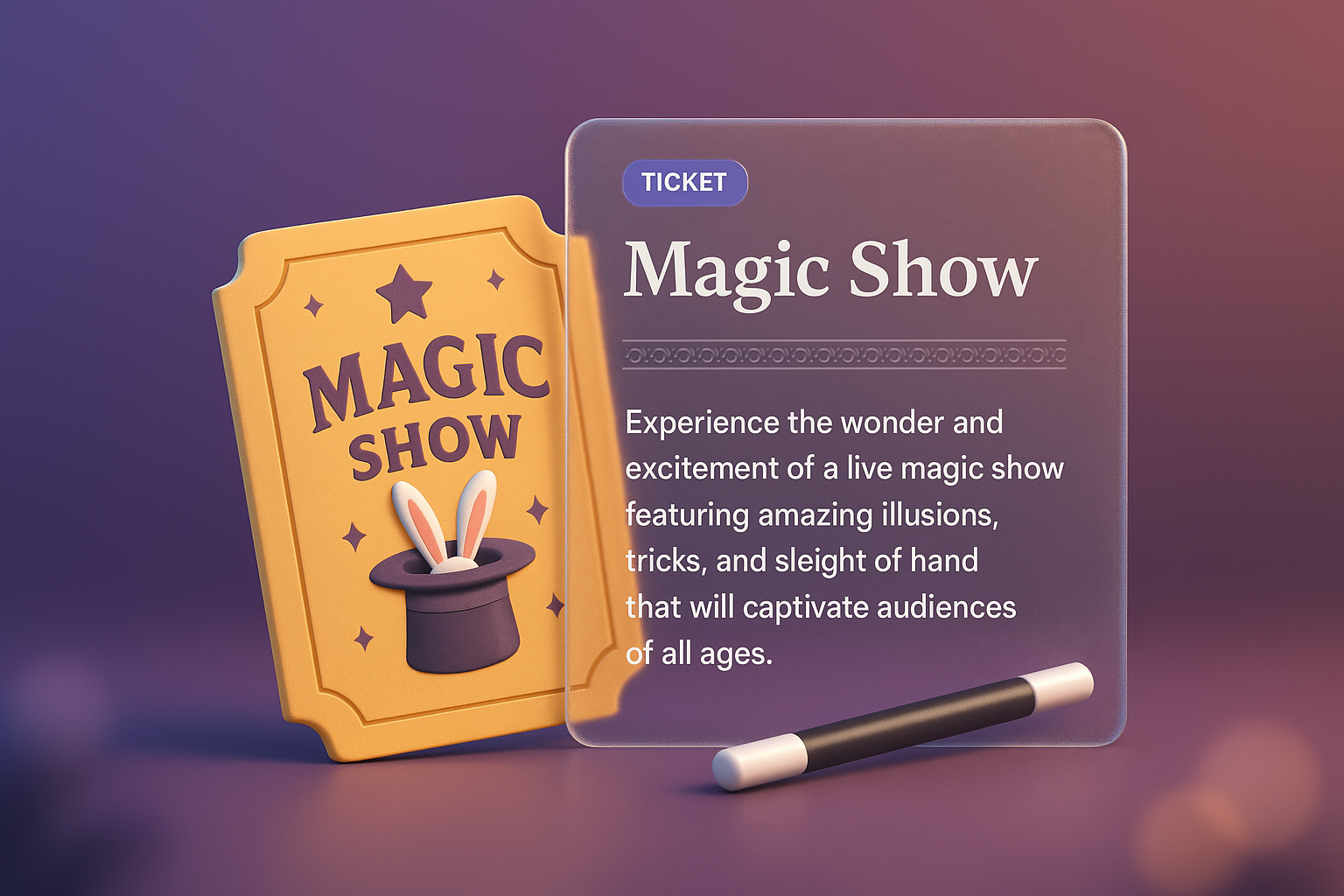/Collection: , /by davooda/Type: PNG/A vibrant 3D illustration of a magic show ticket featuring a magician's hat and playful elements. The design includes a transparent block with details about the show.