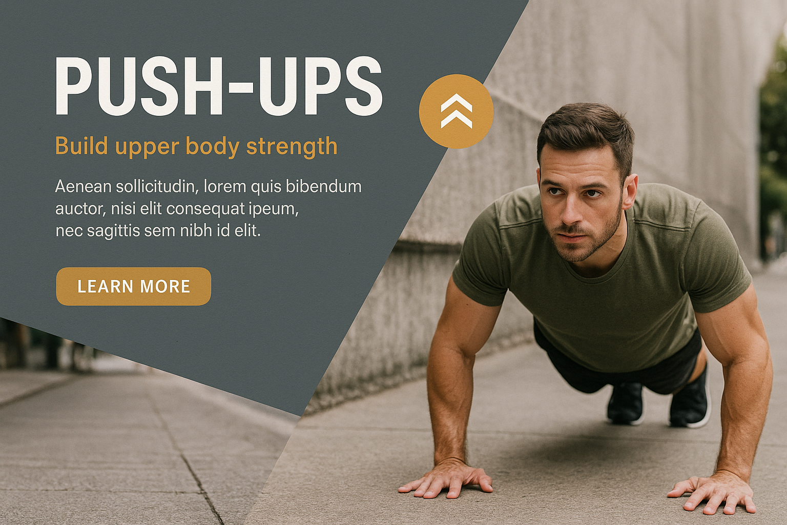 /Collection: /by davooda/Type: PNG/This image features a man performing push-ups on a sidewalk, surrounded by a geometric layout. The design includes a clear title, subtitle, and action button, emphasizing fitness.