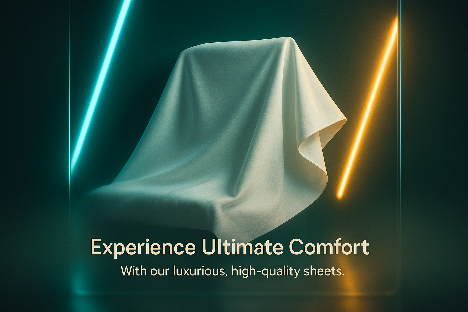 /Collection: /by davooda/Type: PNG/An elegant advertisement showcasing a draped sheet illuminated by neon lights, creating a soft, glowing effect. The design features deep greens and warm golds for a luxurious feel.