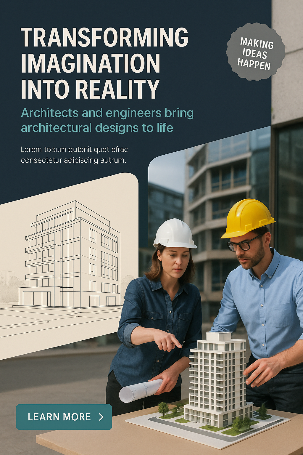 /Collection: /by davooda/Type: PNG/The image showcases architects and engineers collaborating on a construction model, highlighting the blend of imagination and tangible design in architecture. A professional, engaging aesthetic is present.