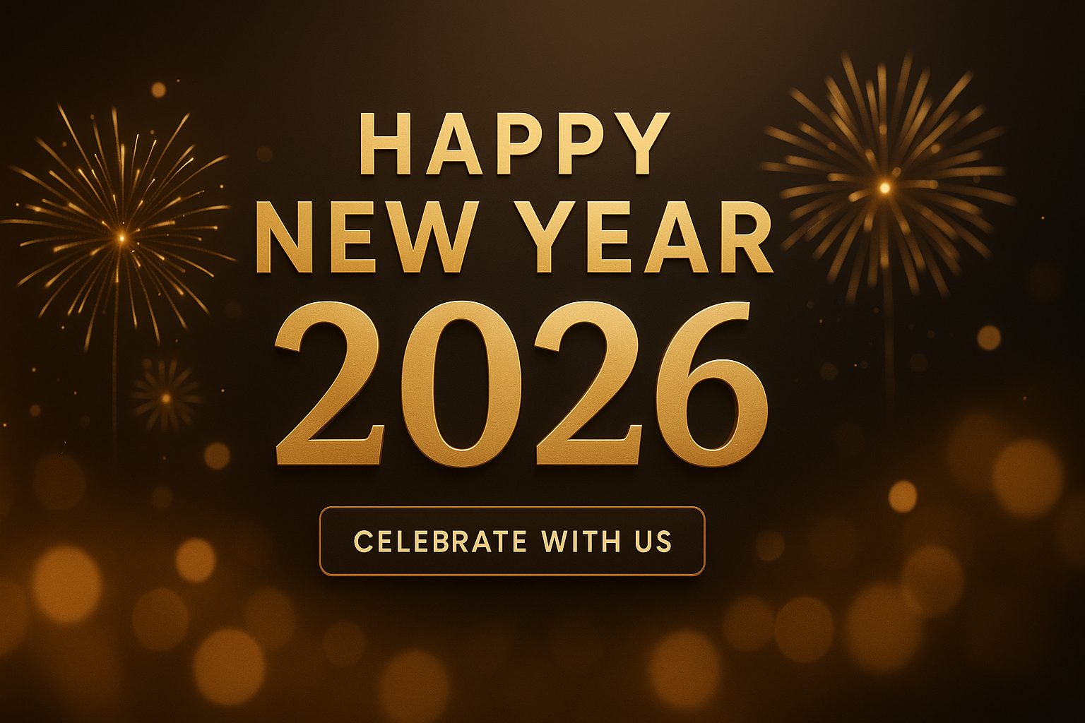 /Collection: /by davooda/Type: PNG/Festive graphic celebrating New Year 2026, featuring golden typography and fireworks against a dark background, perfect for social media posts or event invitations.
