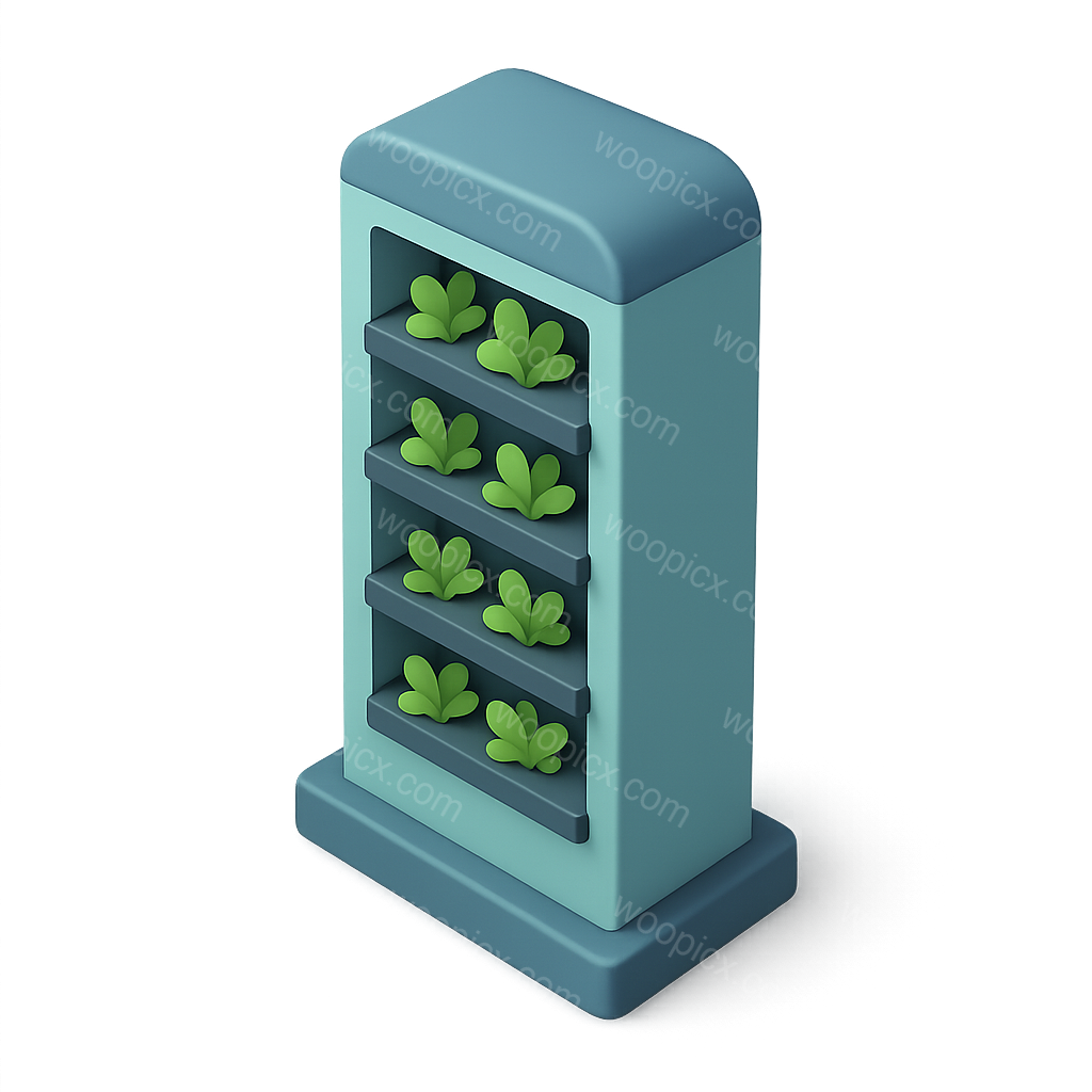 A visually appealing 3D vertical farming tower icon featuring multiple layers of leafy greens. The design showcases a modern isometric style with a clean, transparent background.