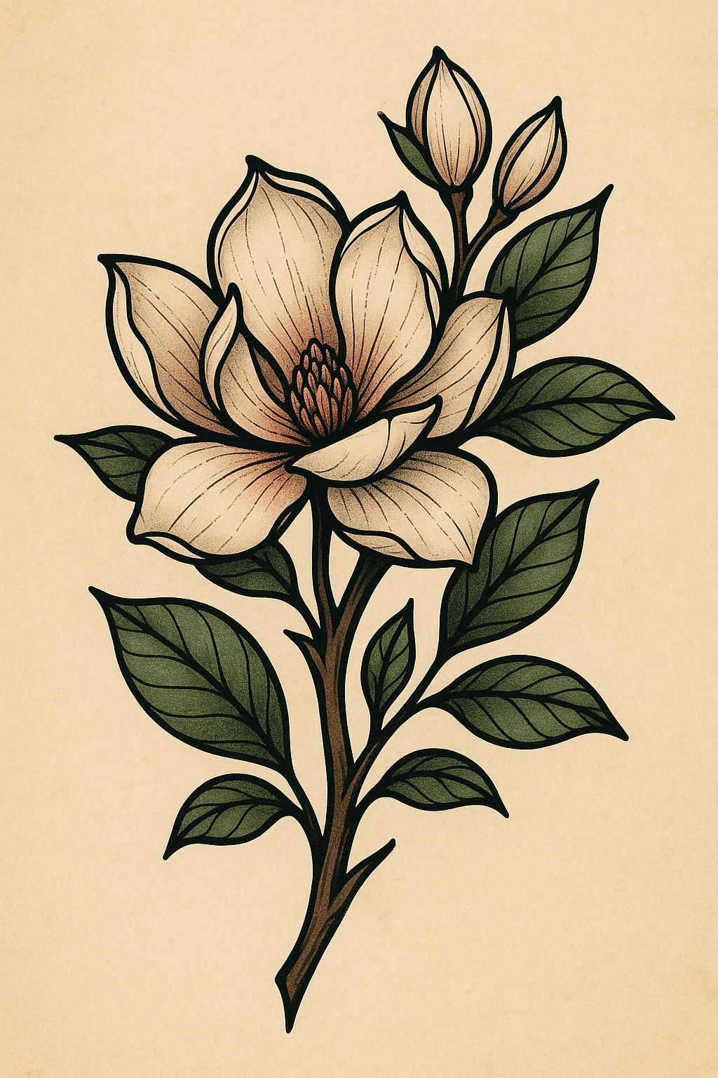 /Collection: /by davooda/Type: PNG/This is a detailed illustration of a magnolia flower with leaves, designed in a vintage style. It can be used for botanical art prints or decorative purposes.