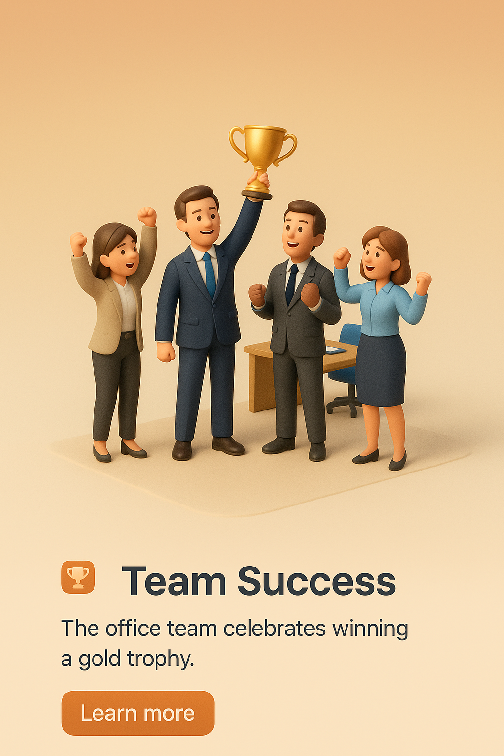 /Collection: /by davooda/Type: PNG/A 3D scene depicting a business team joyfully celebrating their victory with a gold trophy. The characters are shown in an office setting, exuding achievement and teamwork.