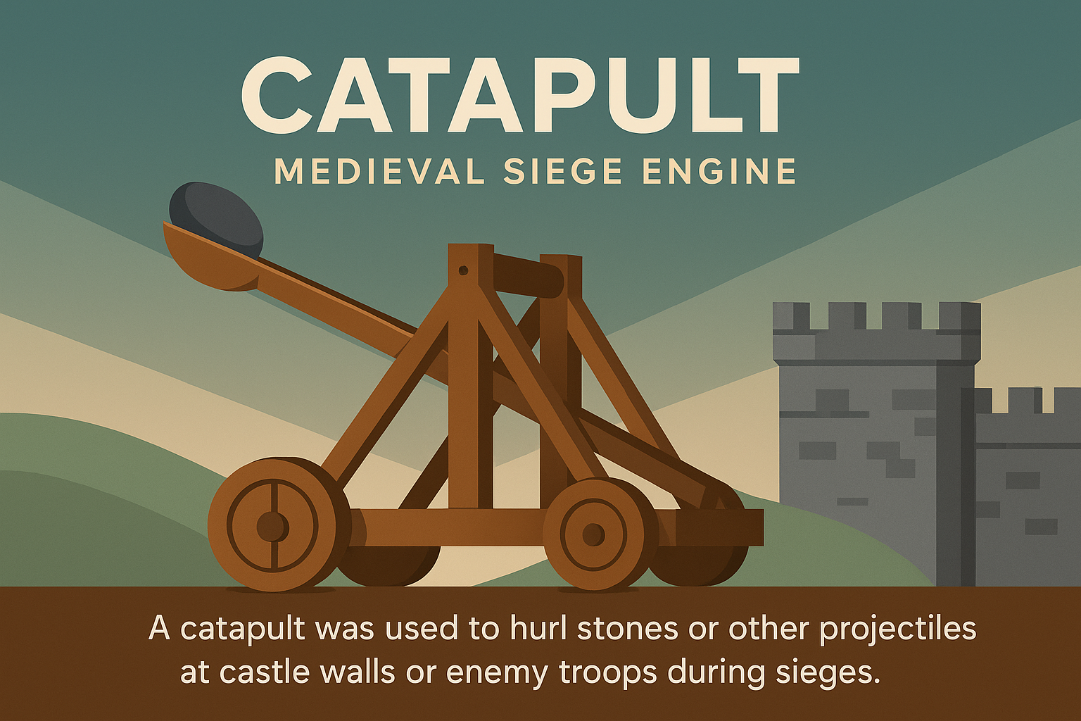 /Collection: /by davooda/Type: PNG/The image showcases a modern interpretation of a catapult, featuring a layered composition with a gradient background and geometric shapes. The design includes informative text about its historical use.
