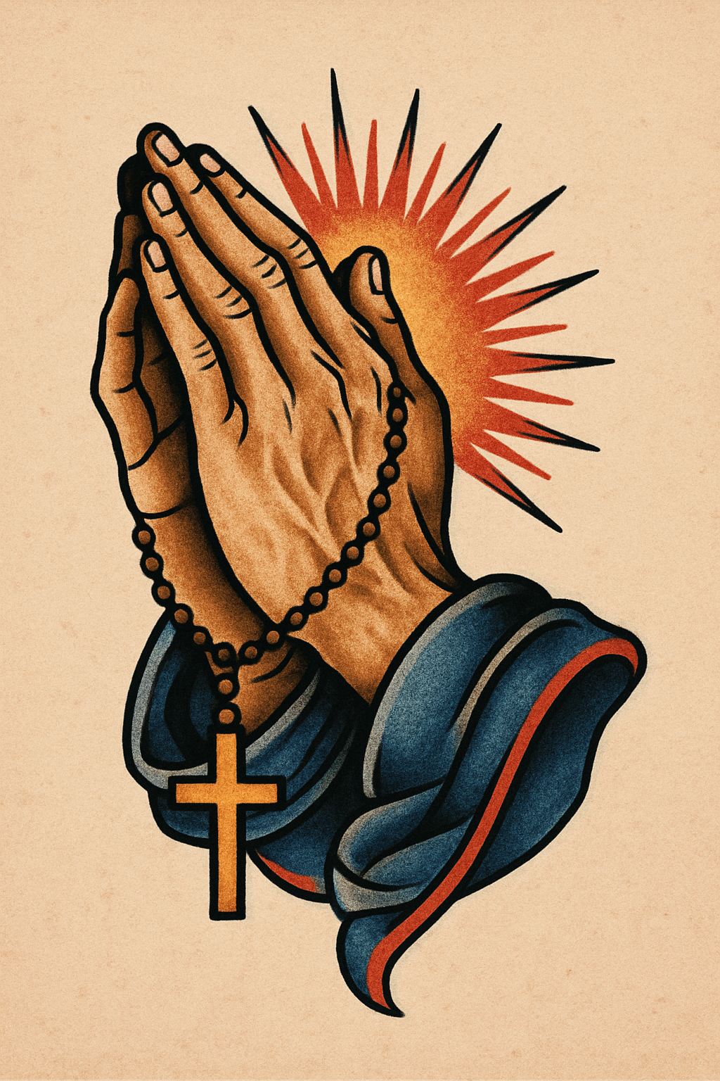 This image depicts a stylized illustration of hands in prayer, holding a rosary, with a radiant sunburst. It blends traditional and modern art styles, suitable for religious or inspirational contexts.
