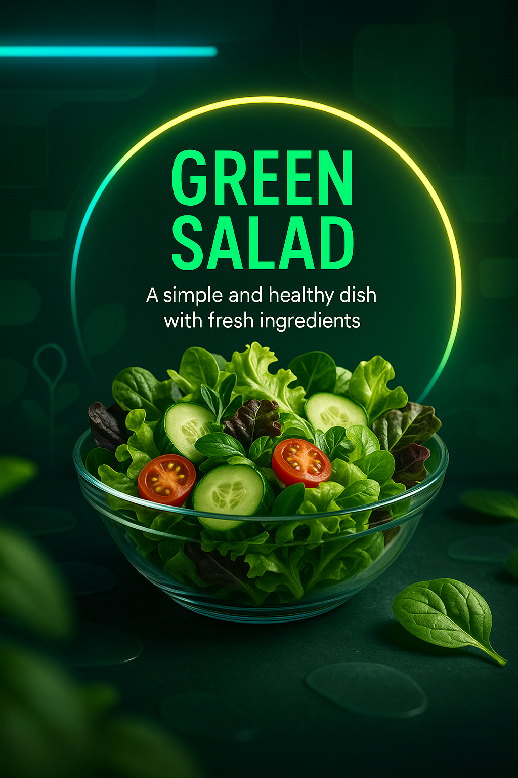 A visually appealing image showcasing a fresh green salad in a glass bowl. The vibrant colors and modern design elements highlight the dish's freshness, making it ideal for health-focused culinary content.