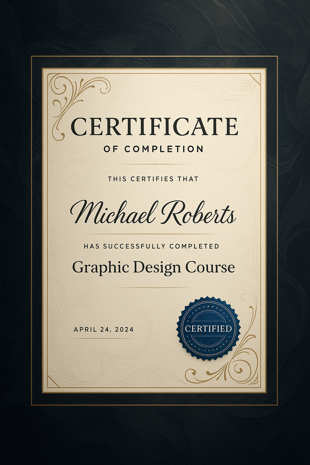 Formal certificate design featuring ornate borders and a seal, ideal for educational achievements and course completions.