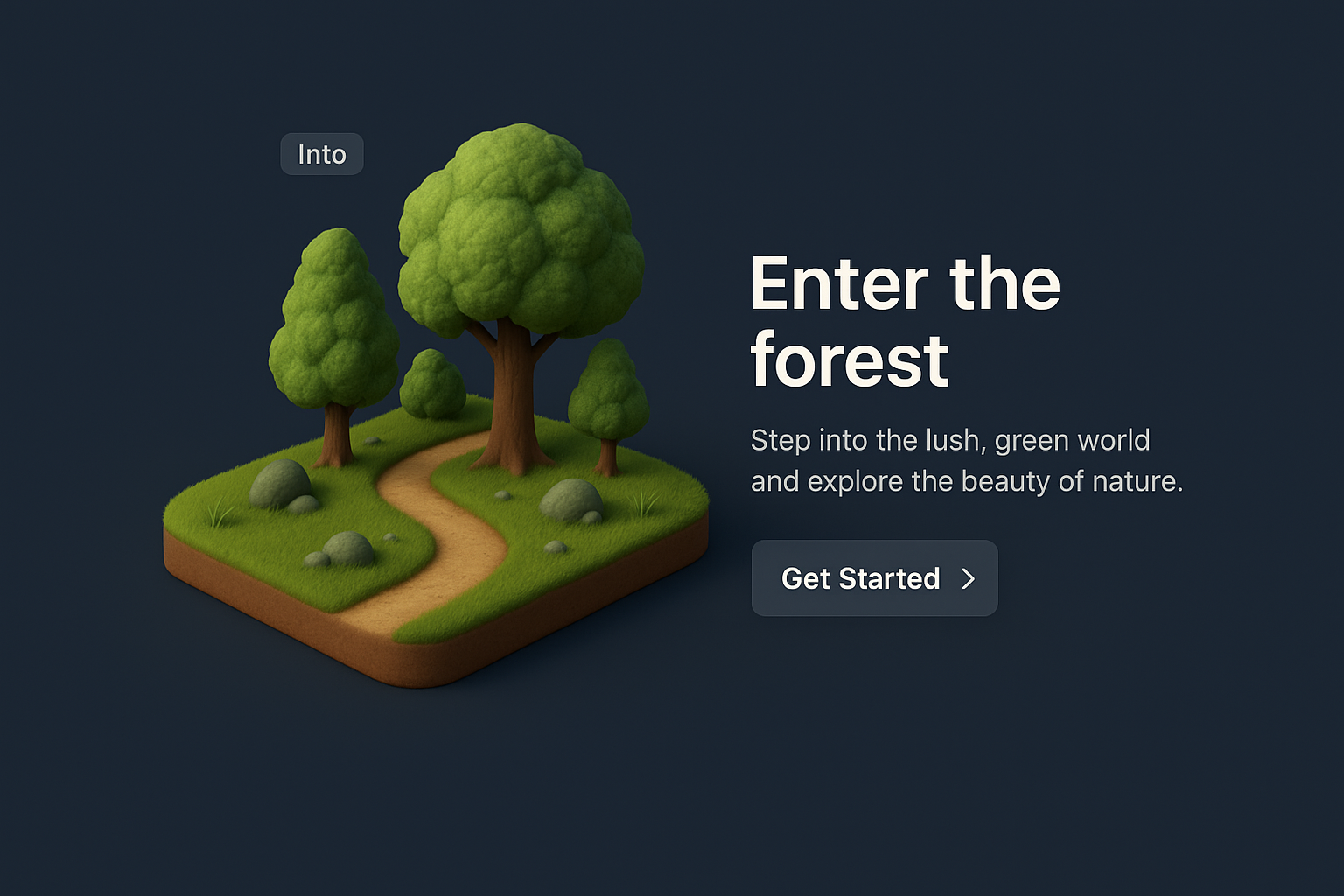 A zoomed-out 3D illustration of a forest featuring trees, a winding path, and a call-to-action button, all set against a dark gradient background.