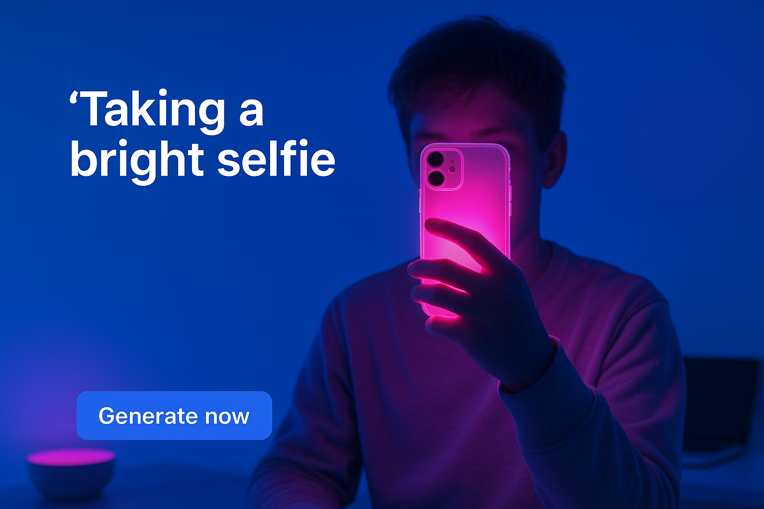 A person takes a selfie with a phone emitting a neon pink glow, set against a solid blue background. The glow creates a vibrant atmosphere, illuminating the surroundings.