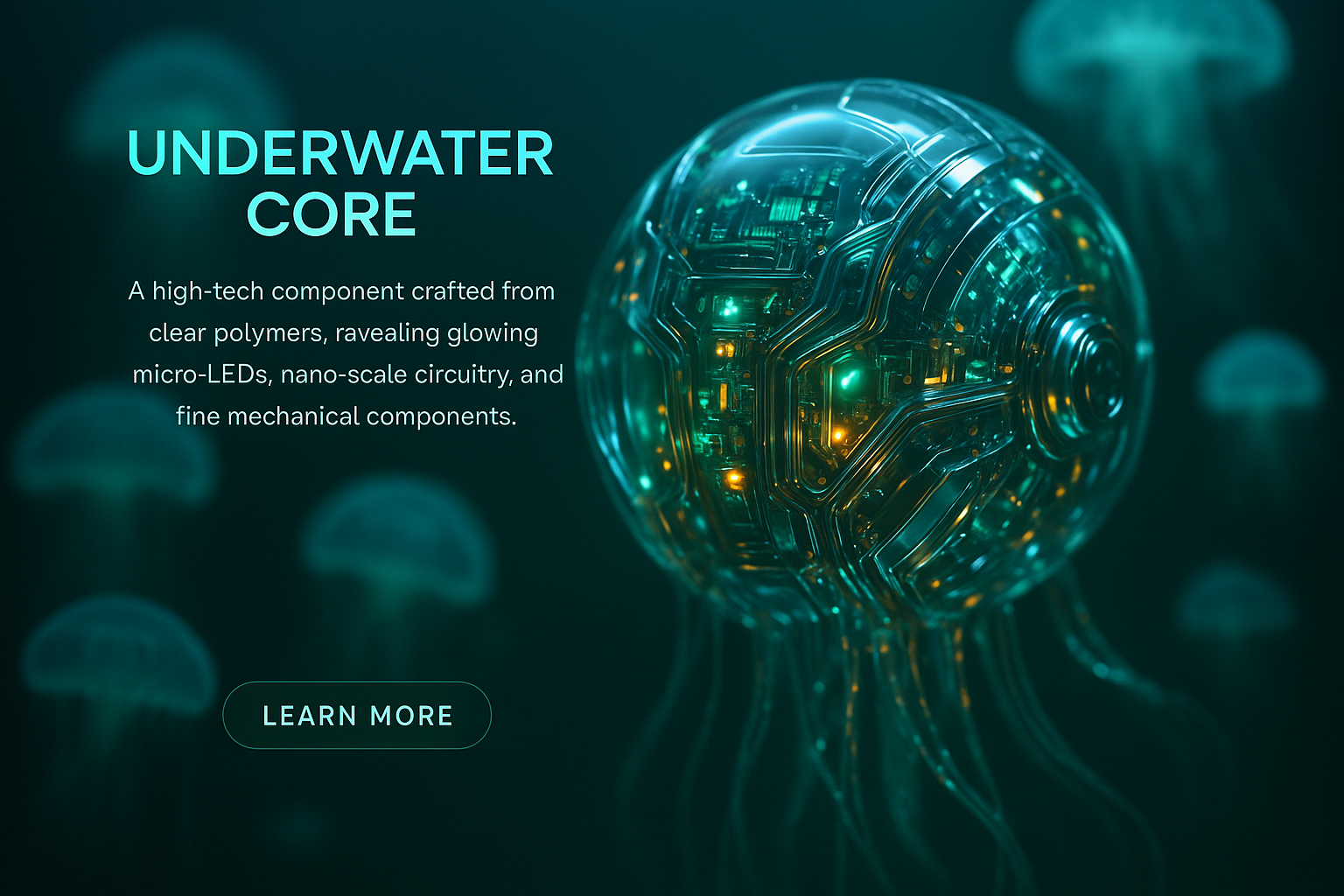 /Collection: /by davooda/Type: PNG/A hyperrealistic underwater core, surrounded by glowing jellyfish, showcases a stunning inner world of micro-LEDs and intricate circuitry. The design features glass-like polymers and metallic components reflecting ambient light.