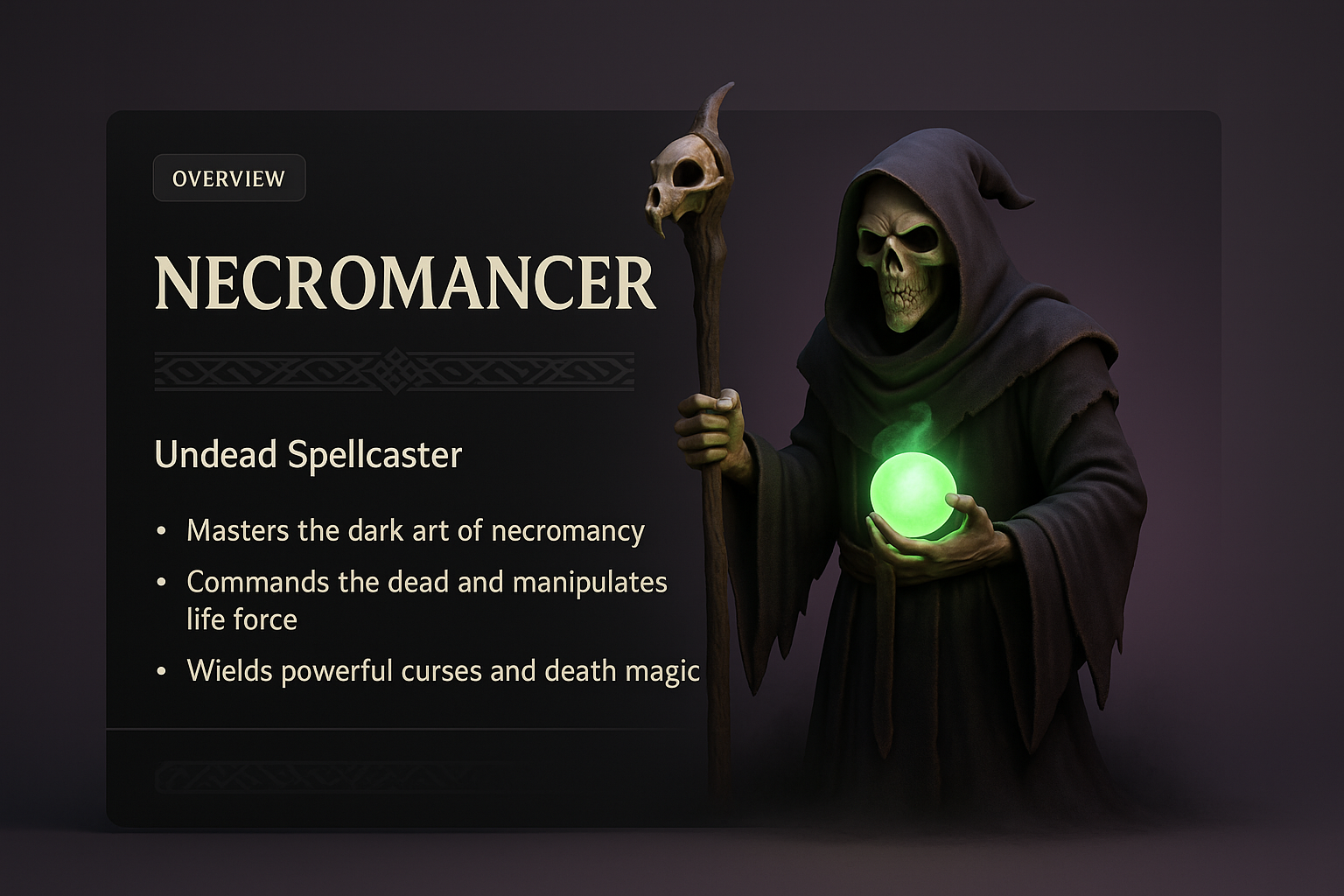 Dark Fantasy Necromancer Character Illustration with Infographic