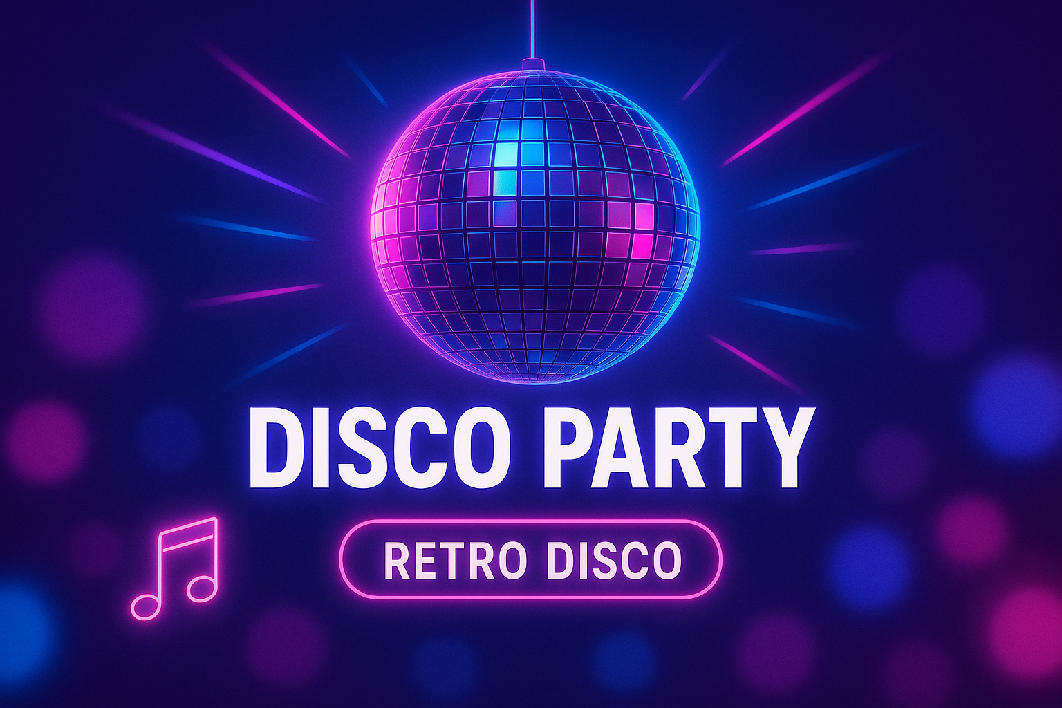 Colorful digital graphic featuring a disco ball and vibrant lighting effects, perfect for promoting retro-themed events or parties. Ideal for social media and event marketing.