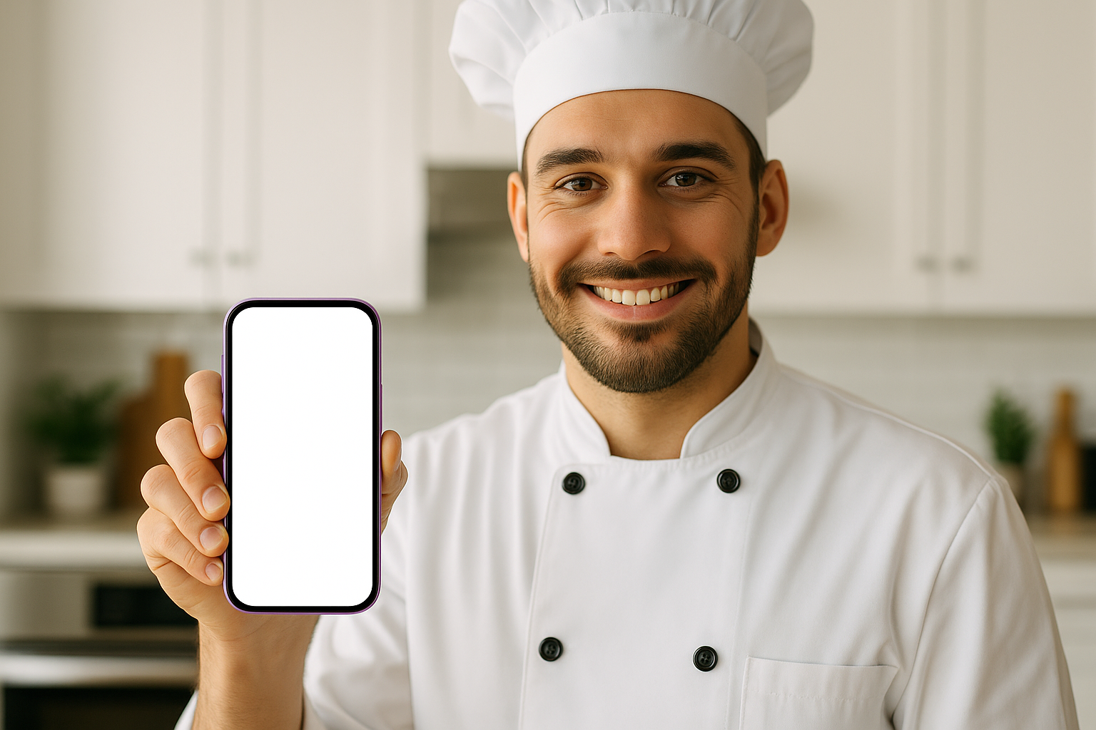 A male chef in a white uniform and hat smiles while holding a purple phone with a blank screen in a contemporary kitchen setting.