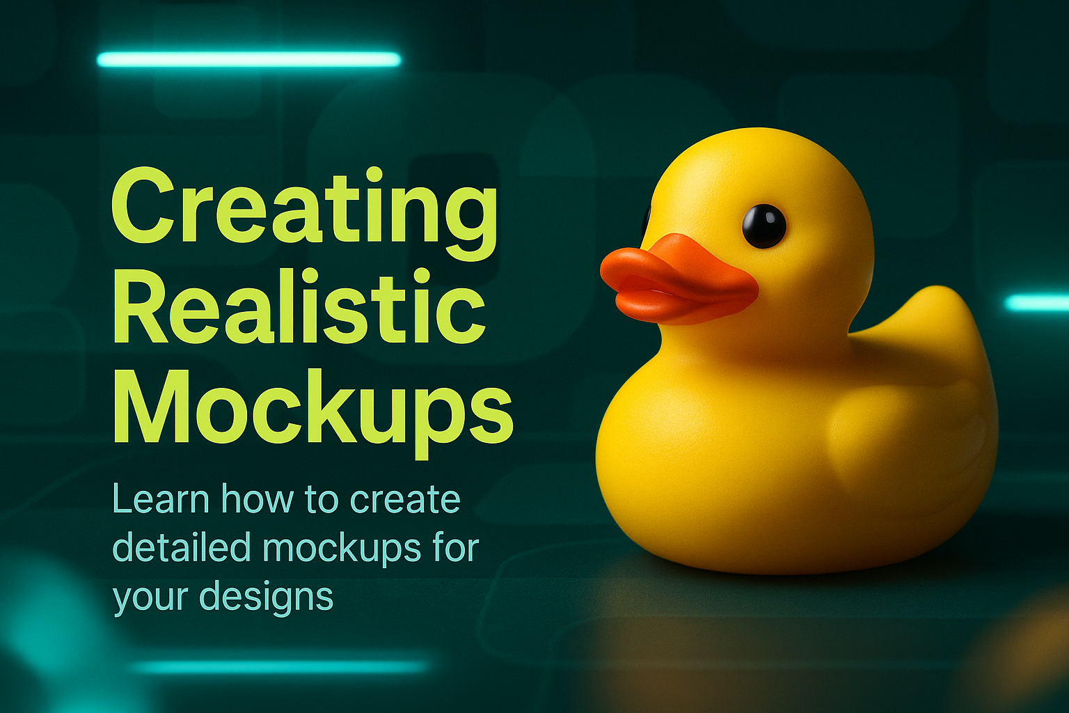 Vibrant graphic featuring a 3D rubber duck and bold typography, aimed at promoting a tutorial on creating realistic mockups for design projects.