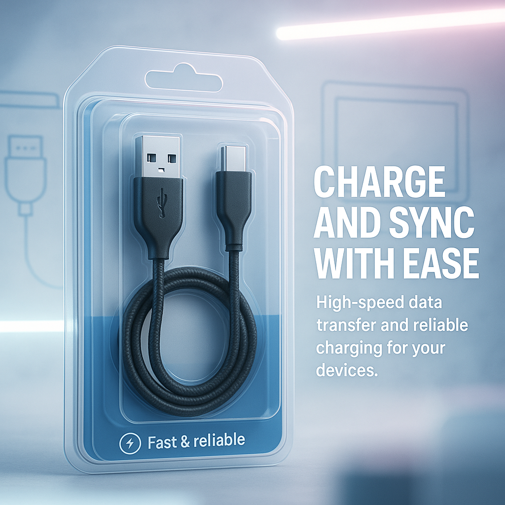 Modern product packaging design featuring a black USB charging cable, highlighting its features of fast data transfer and reliable charging, ideal for e-commerce or retail display.