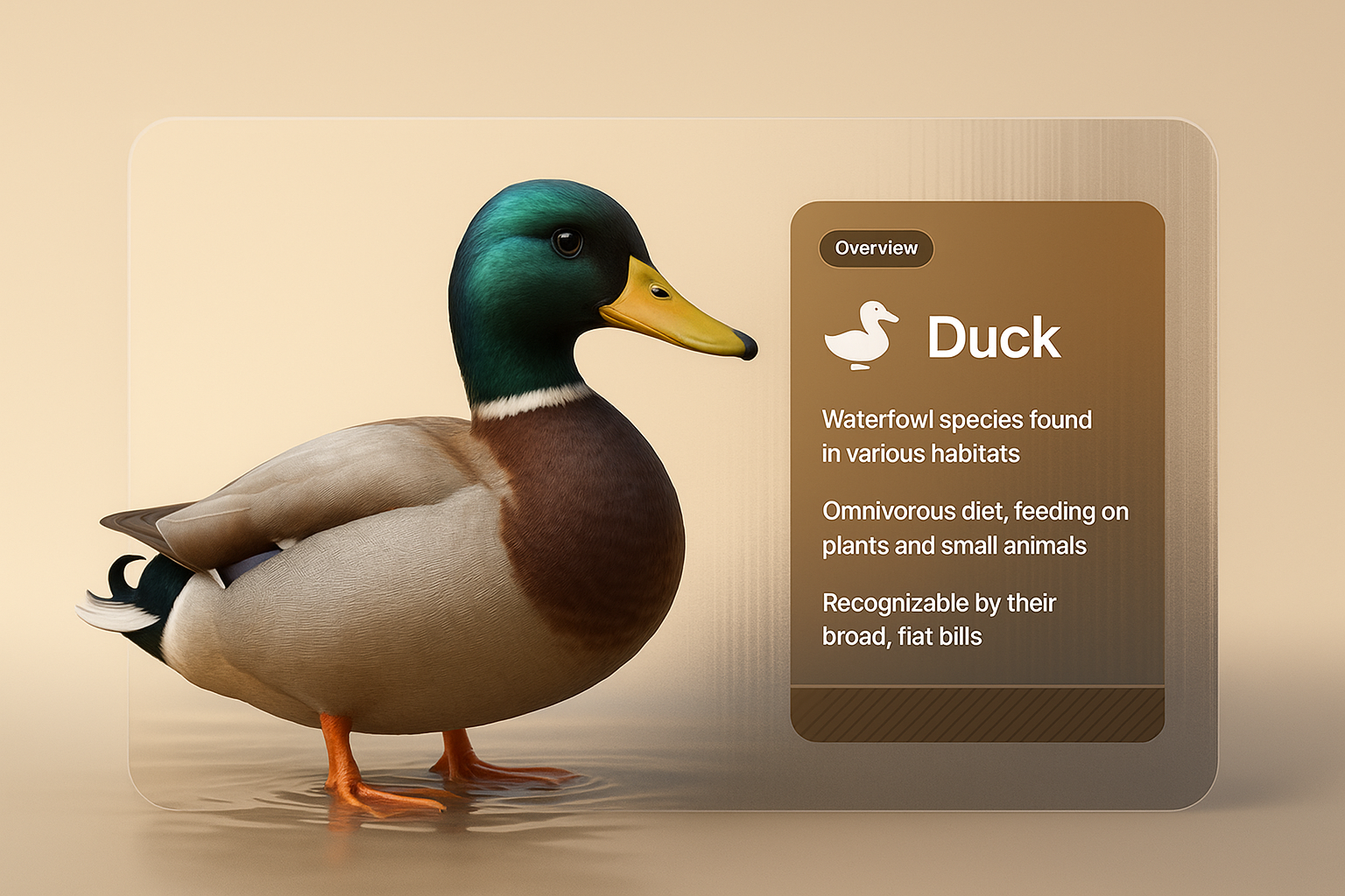 /Collection: /by davooda/Type: PNG/A realistic 3D illustration of a duck with an integrated informational overlay. The background features a smooth gradient, enhancing the visual appeal while providing clear text readability.